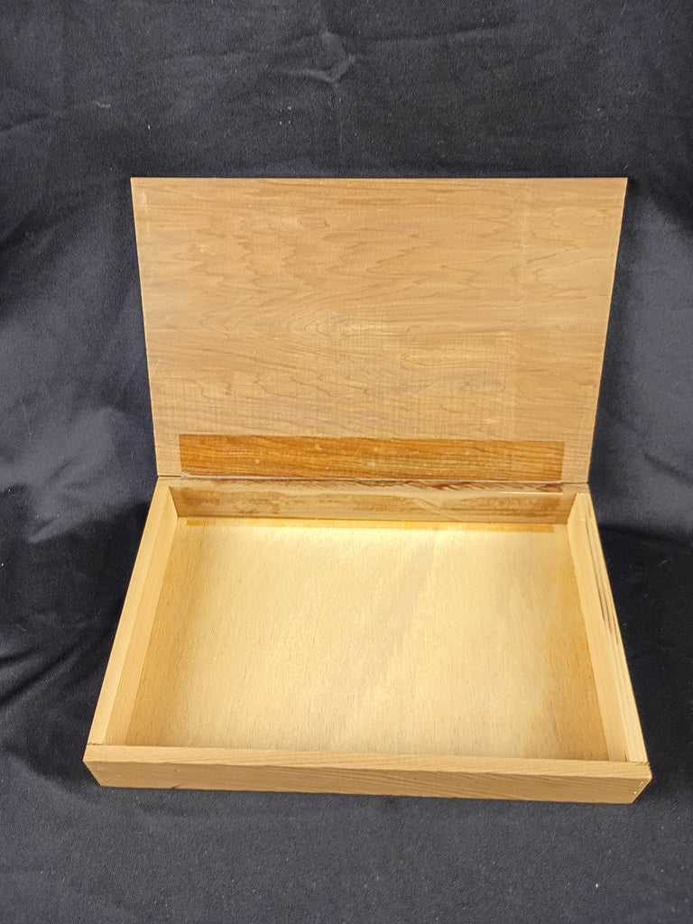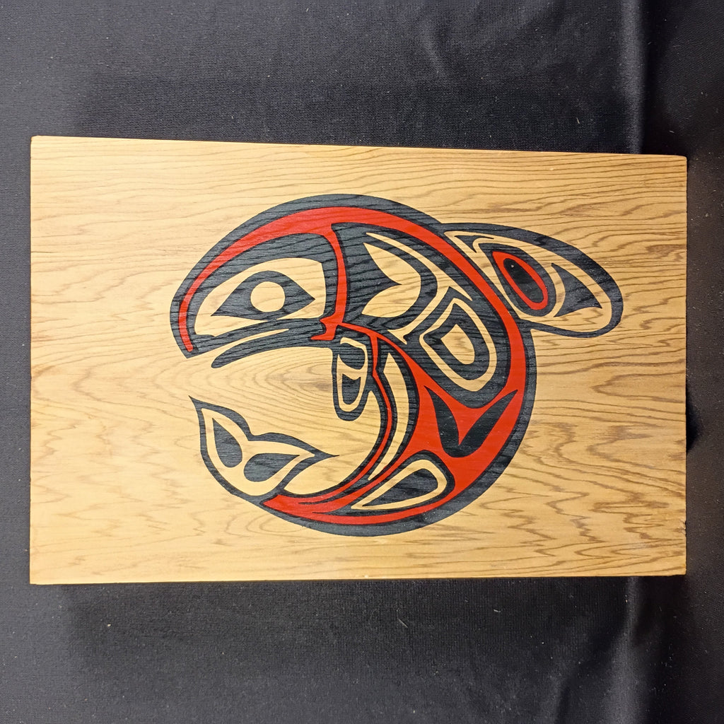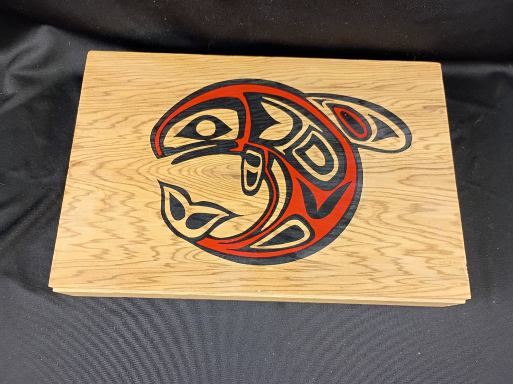 Lovely wooden box made in Juneau, Alaska. Features an indigenous illustration of a whale in black and red on the cover. Measures appx 11"L x 7"W x 2"H. In excellent condition.