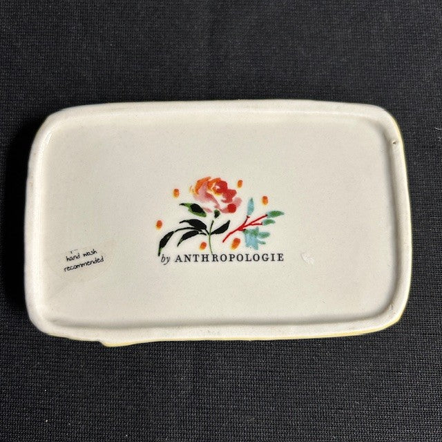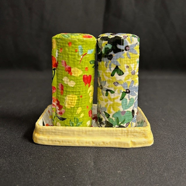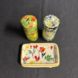 This set includes a salt shaker and pepper shaker and a small tray. Crafted from hand-painted glazed stoneware. Feature rubber stoppers at the base. Floral motif. Shakers measure 3.25"H x 1.375"W each, matching tray is 4.5"L x 2.75"W. All in great condition.