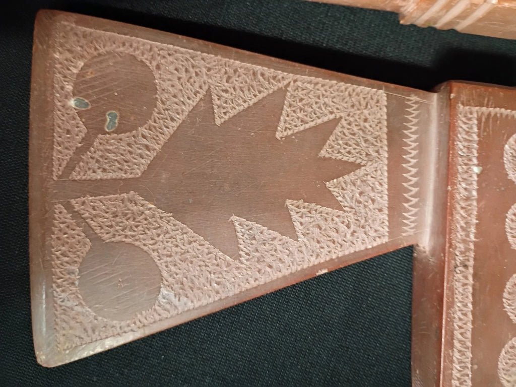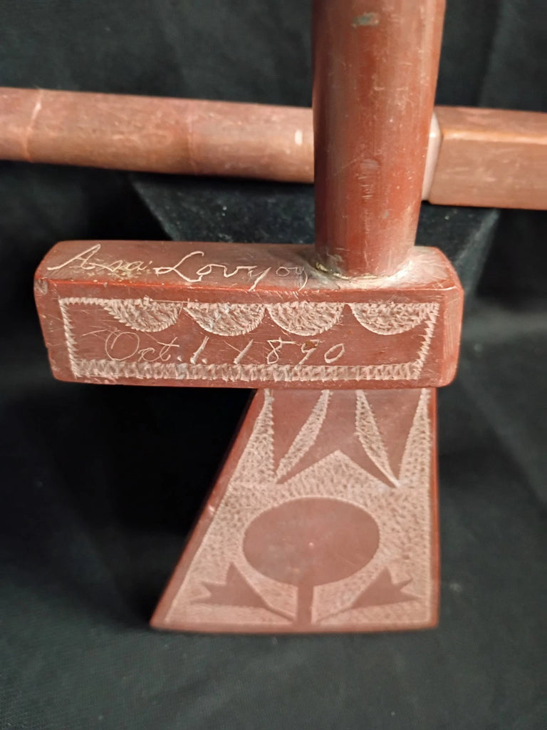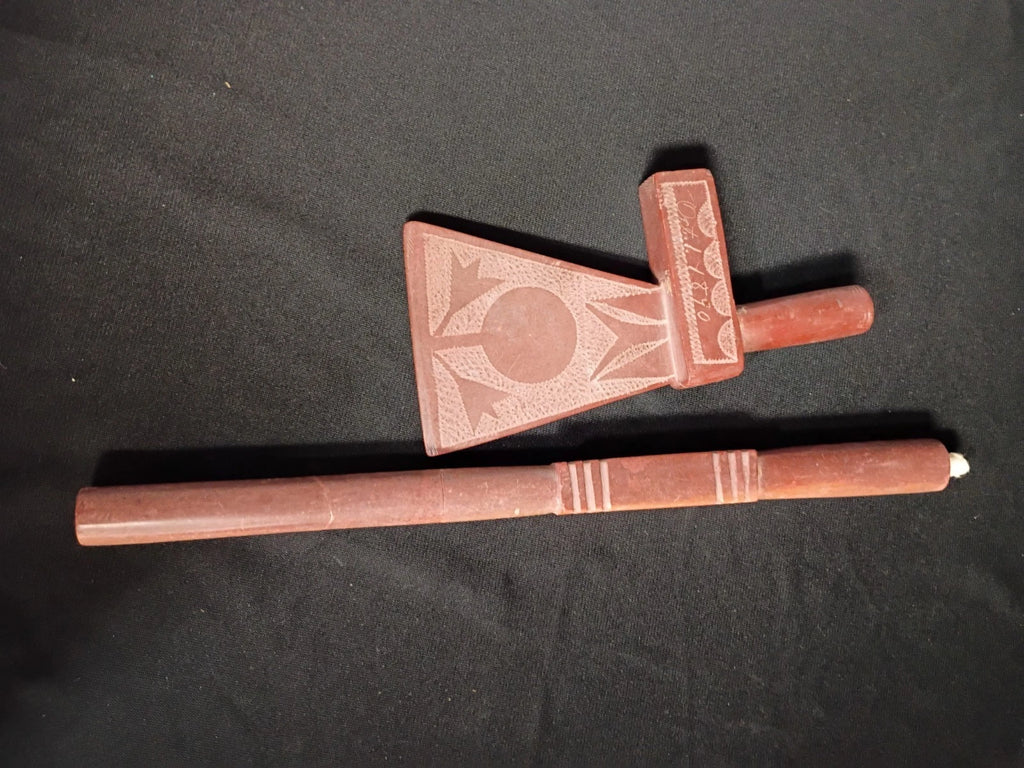 Gorgeous engraved tomahawk shaped pipe bowl attributed to the Northern Plains Indians. The pipe is dated (1890) and signed. In excellent condition. Comes with matching stem which is also carved from catlinite. The pipe bowl measures 7.45"L x 3.25"W x 1"D, the stem measures 13"L x 1"W x 1"D. Small crack in the stem, and minor imperfections in the bowl (see photos), but in overall excellent condition especially considering its age.