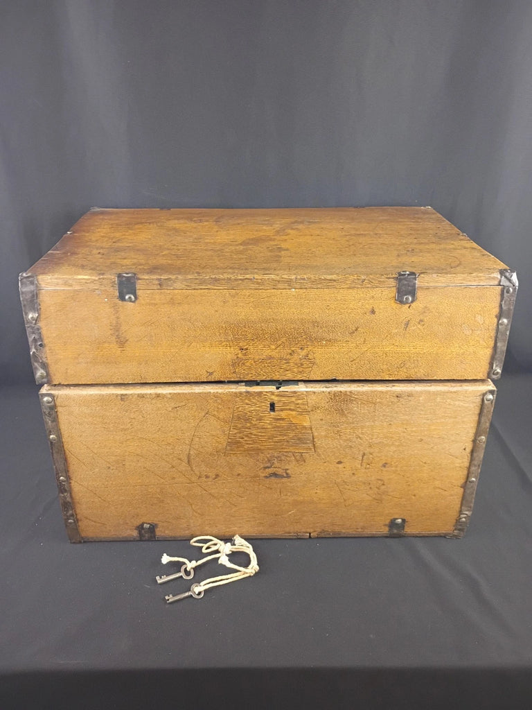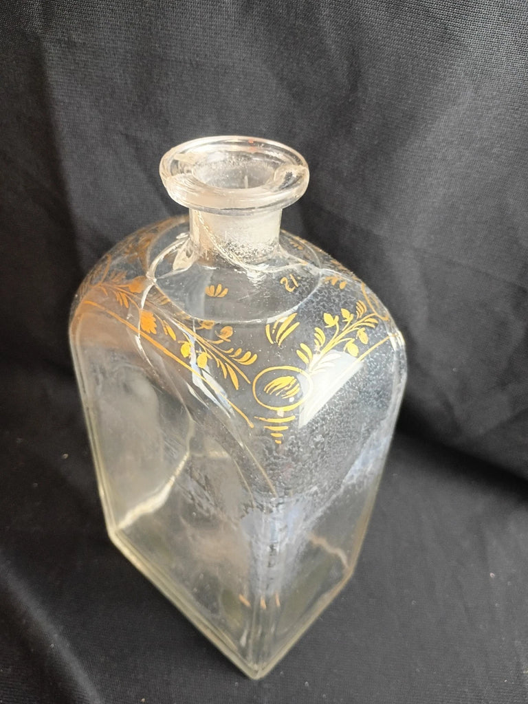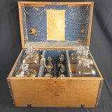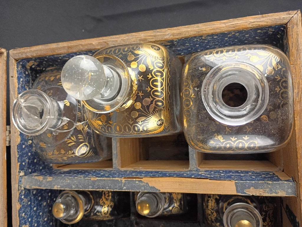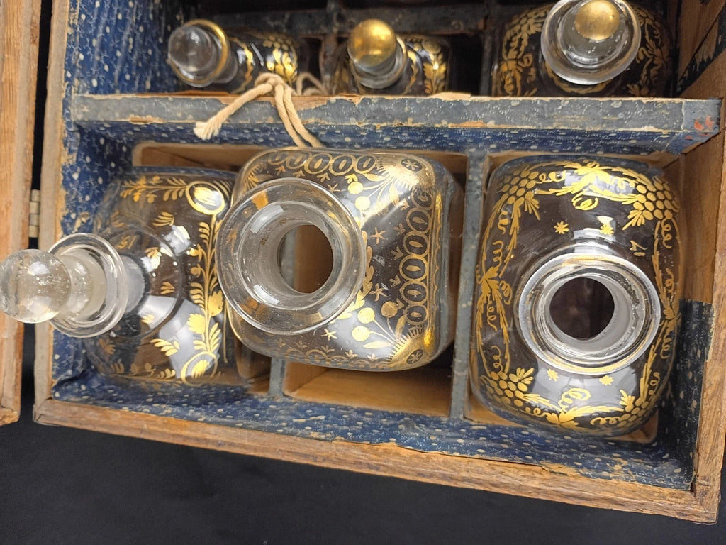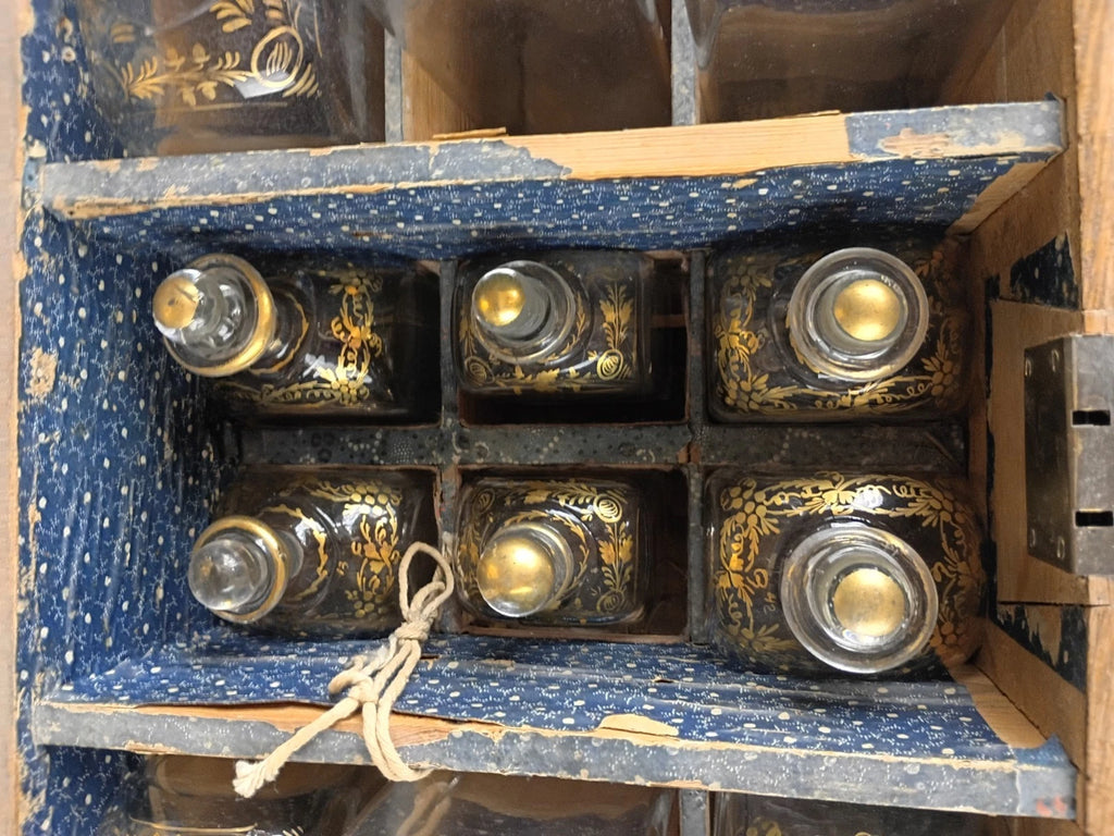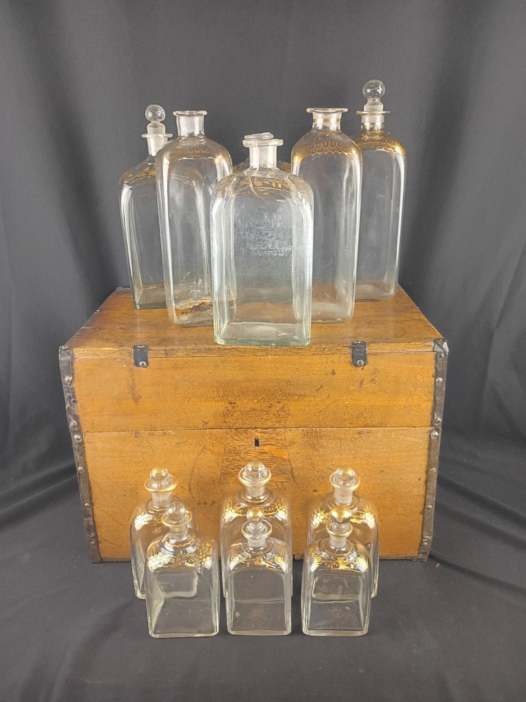 Antique Sea Captain's Liquor Box with glass liquor bottles. Comes with 12 bottles; one for each compartment. Chest has lock and hammered iron corners. Of the twelve bottles 4 are missing stoppers, one has a crack at the top, and 2 have sediment at the bottom. Some color loss to the gold filigree designs at the top of each bottle (see photos) otherwise in great condition especially considering its age. Bottles range from 3"L x 2"W x 6"H to 3" cube x 10"H. Message with any questions. Flaws reflected in price.