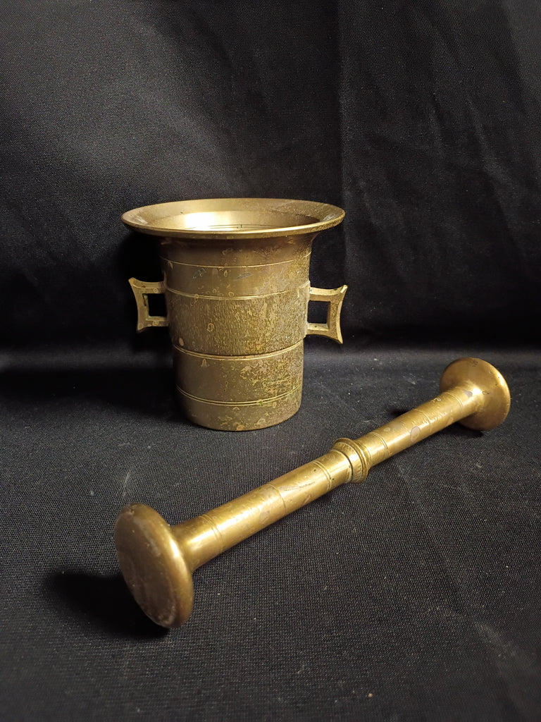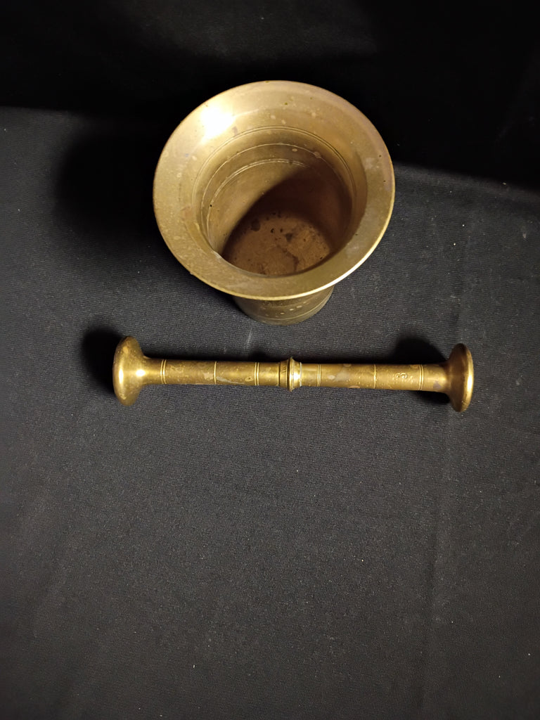 Antique solid brass mortal and pestle. In great condition. Mortar measures 4"H x 4.5"W. Pestle is 7.5"L x 1.5"W.