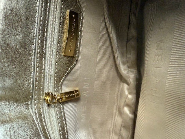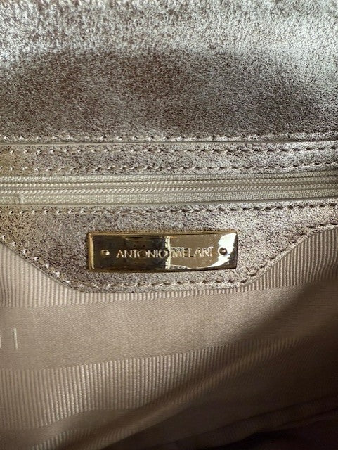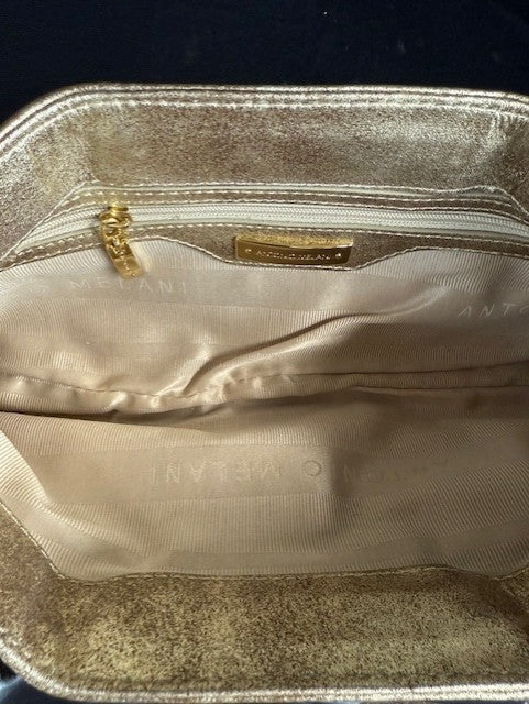 Vintage Antonio Melani Gold Leather Clutch. Laser cut metallic look. Great evening bag. Measures 12"L x 5"H. In excellent condition.