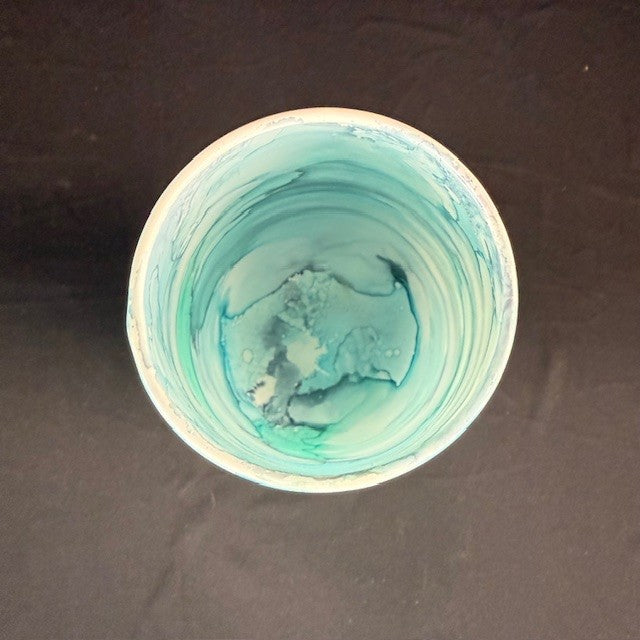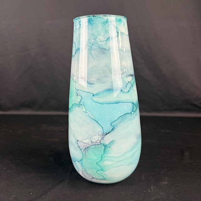 Lovely Art Glass Vase in vary shades of blue/teal. Measures 10"Hx 5"W and 3" opening. In excellent condition.