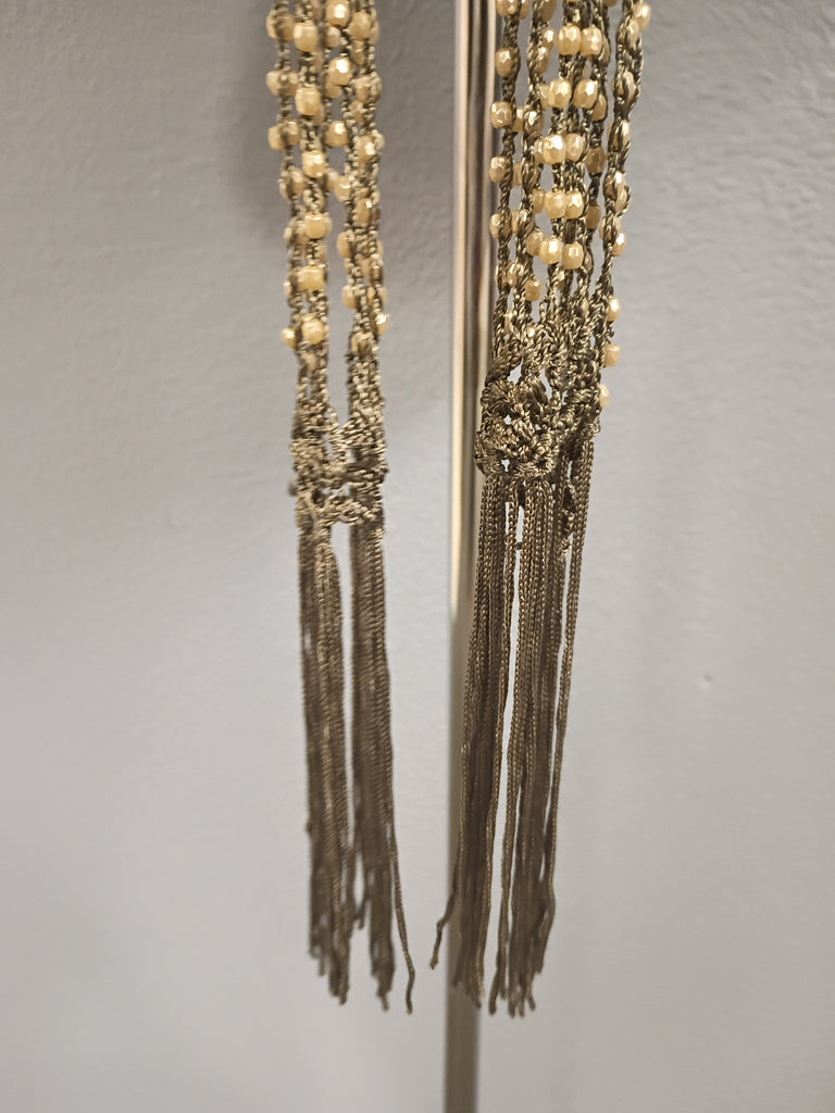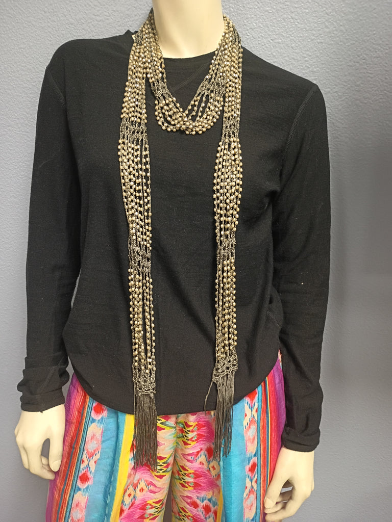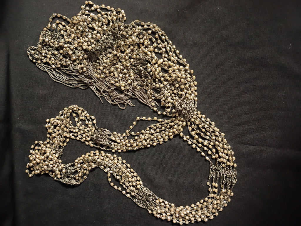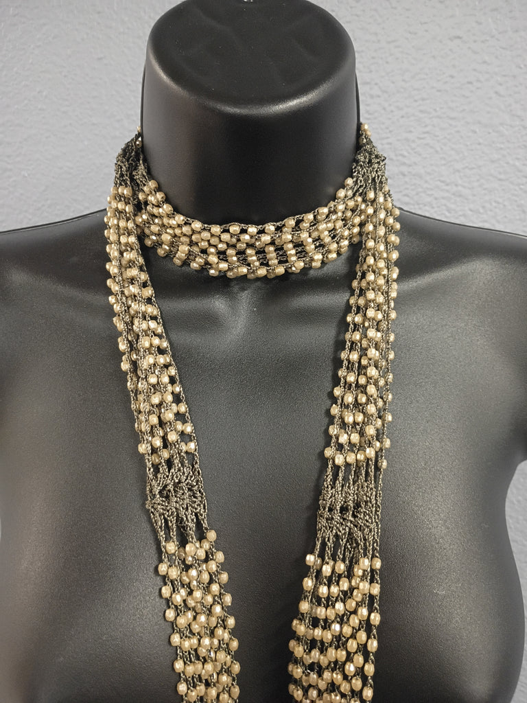 Great condition, pearlescent beads are interwoven into grey silky thread. Crocheted pattern. Can be worn as a sash, or around the neck to dress up any outfit. Versatile and fun piece with a roaring 20s feel. Measures 80" L. by 2" W.