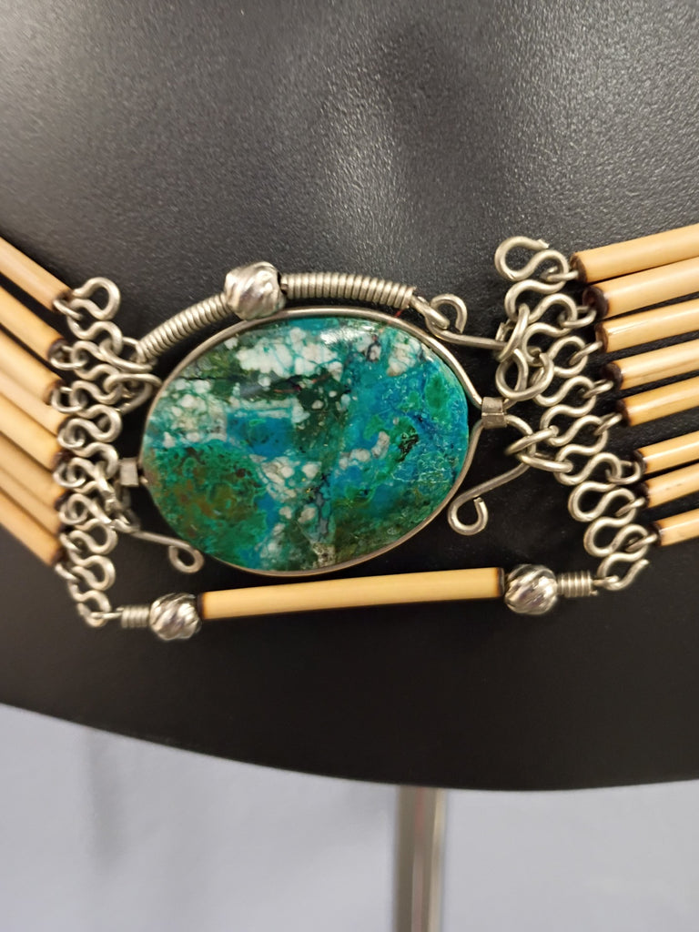 Vintage chain link belt handcrafted from metal, bamboo shoot beads, and a large polished cabochon of blue & green Apatite. Could also be worn as a belly chain or double up as a necklace. In excellent condition. Measures 35"L x 1.5"W.