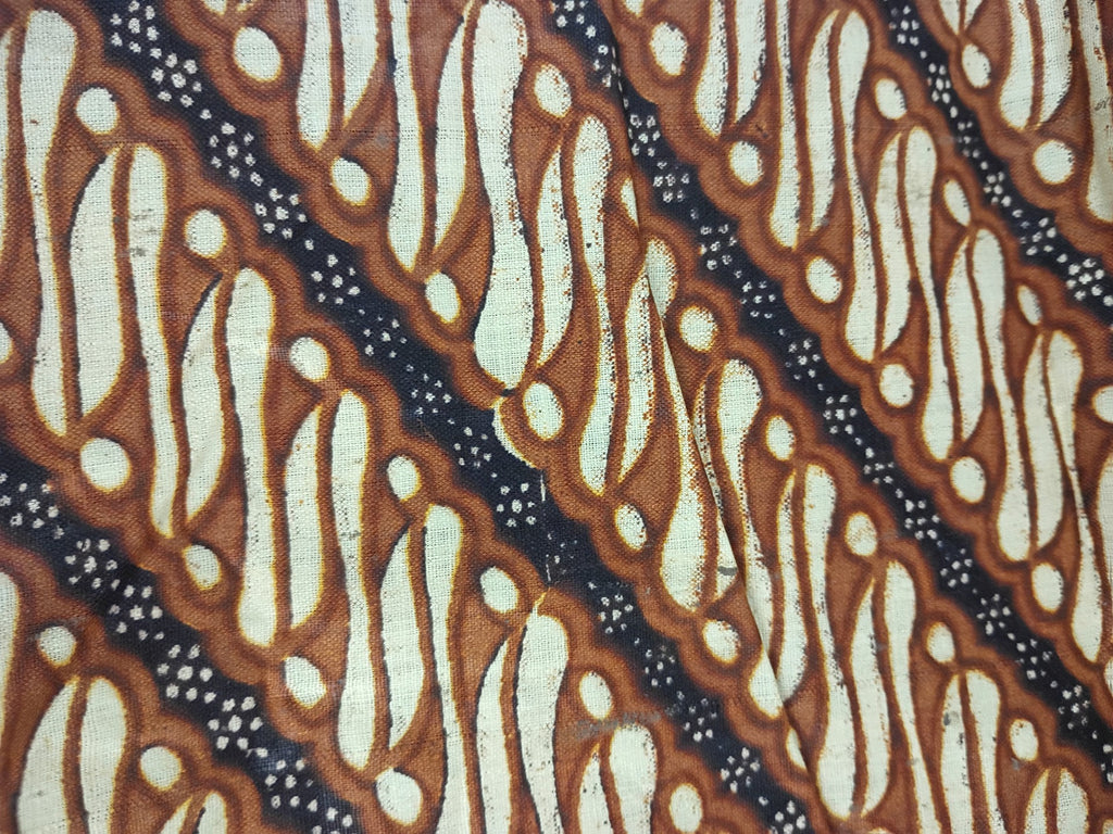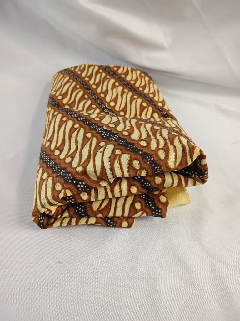 Hand painted fabric using the Batik technique. Likely from Indonesia. Waxy geometric pattern throughout. Measures 70"L x 37"W.