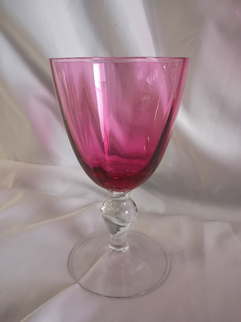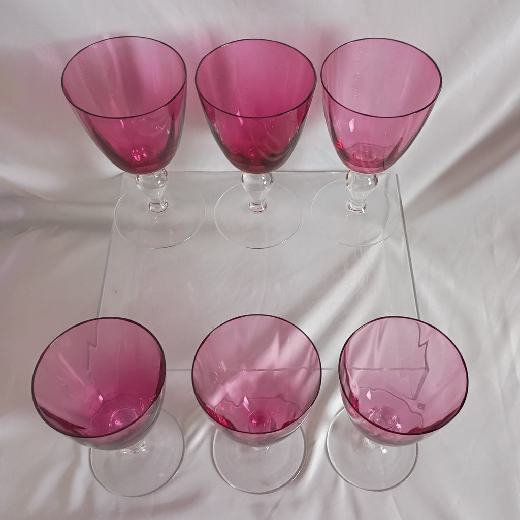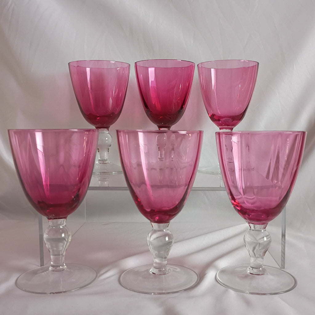 Vintage wine glasses featuring beautiful cranberry colored bowls, paired with clear urn shapes stems. Goblets were made in Bavaria and measure 6"H x 3.25"W each. All in excellent condition. Set of 6.