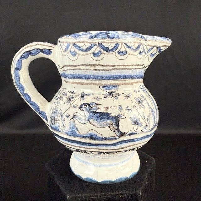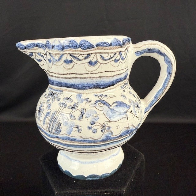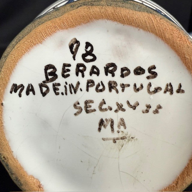 Berardos hand painted pottery from Portugal. Bird, rabbit, castle theme. Measures 4.5"H x 4"W. Tiny chip under the handle.