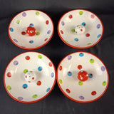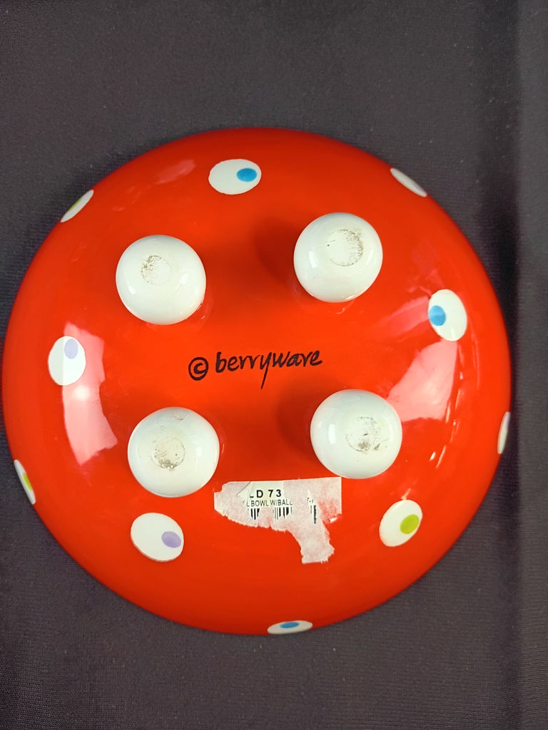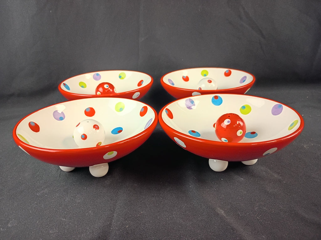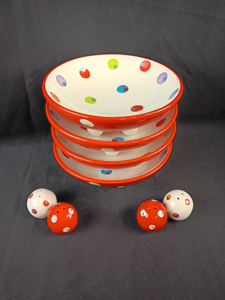 Four Berryware olive footed dessert bowls and two sets salt & peppers in the same pattern. All in good shape. Bowls are 6.25"W x 2.5"H and salt & peppers 1.5" round.