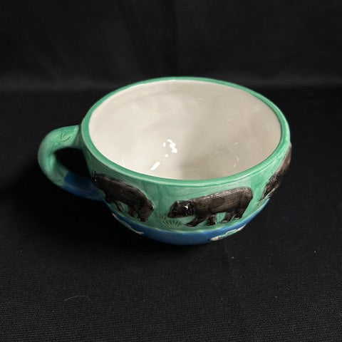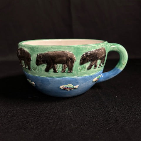 Art pottery soup or latte mug designed by Peggy Jo Ackley for CIC. In excellent condition. Features a design of 6 Black bears along a water stream hunting for trout. Measures 6"L x 5"W x 3"H.