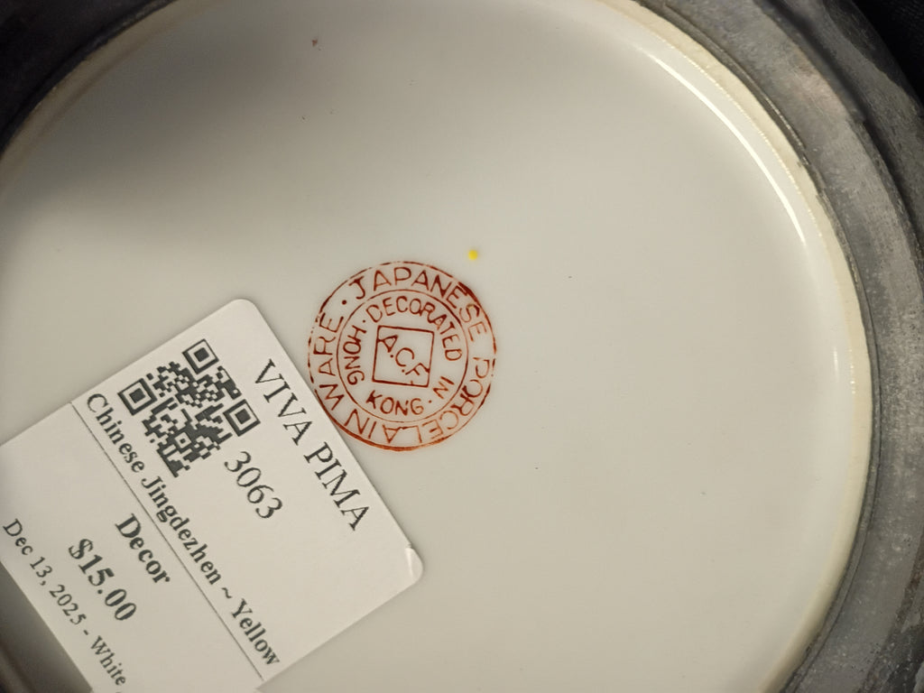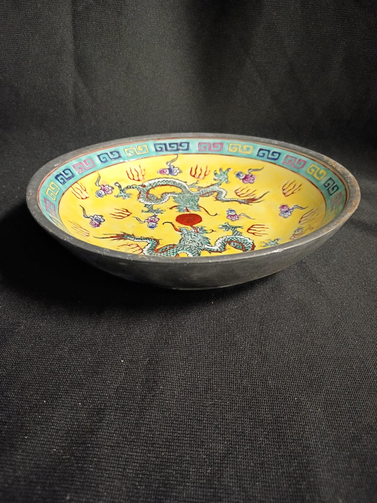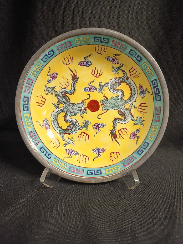 Yellow Famille Rose Double Dragon Porcelain Plate. Measuring 7 1/2" dia x 1 1/2" h. Metal frame in excellent condition.