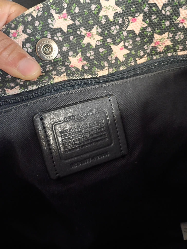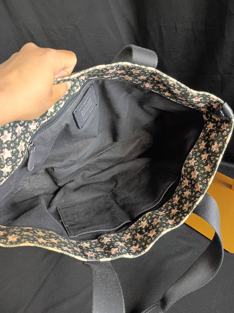 Canvas and leather tote bag from coach. American flag theme. Inside could use a lint roller, but in otherwise excellent condition. Measures 18"L x 6"W x 11"H with a 10" double strap drop.
