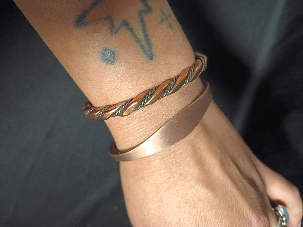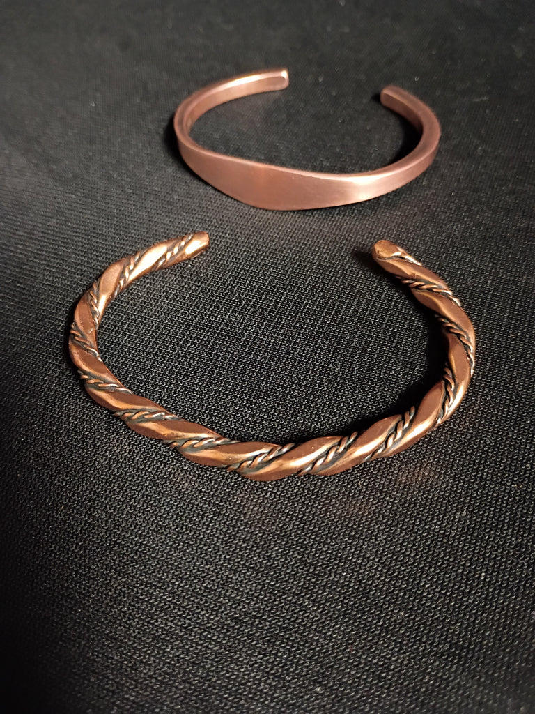 Set of two copper cuffs. One braided, the other hammered flat into a diamond form in the middle. Both are adjustable and in great condition.