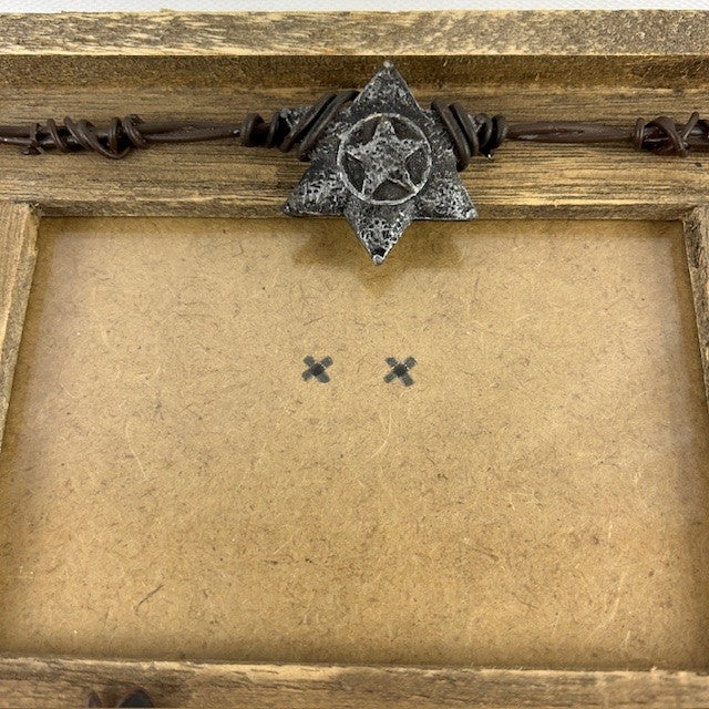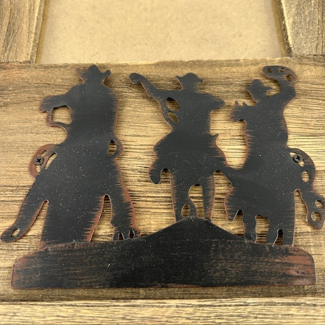Cowboy themed photo frame crafted from natural wood and sheet metal. Measures appx 10.25"L x 8.75"W. Photo area is 3.5"H x 5.625"W for a standard 4" x 6" picture. In great condition.