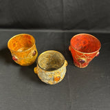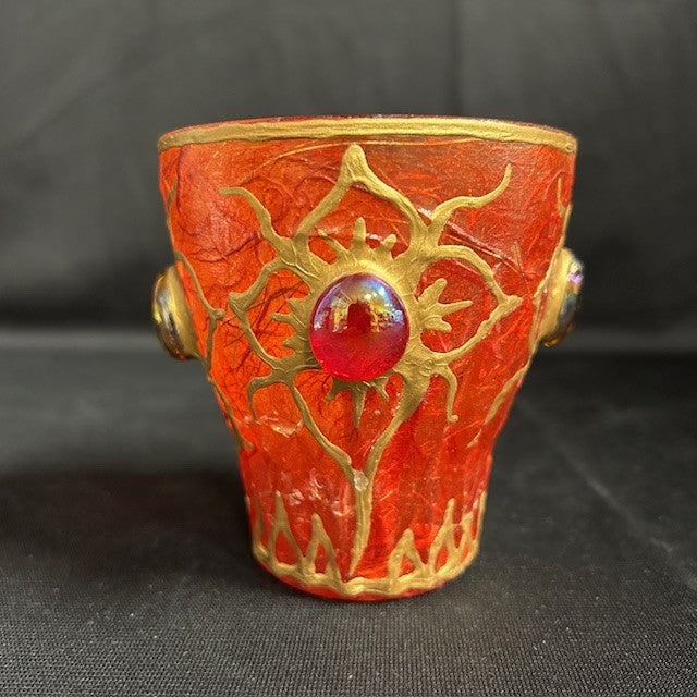 This is a set of three decorative glass votive or tea light candle holders, featuring a gold-toned, hand painted design and embedded jewel accents. Measuring: 3.5"H x 3"W. In excellent condition.