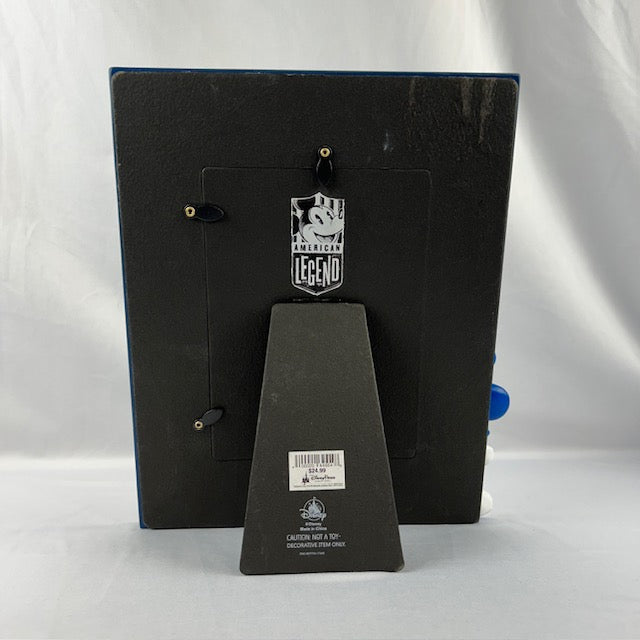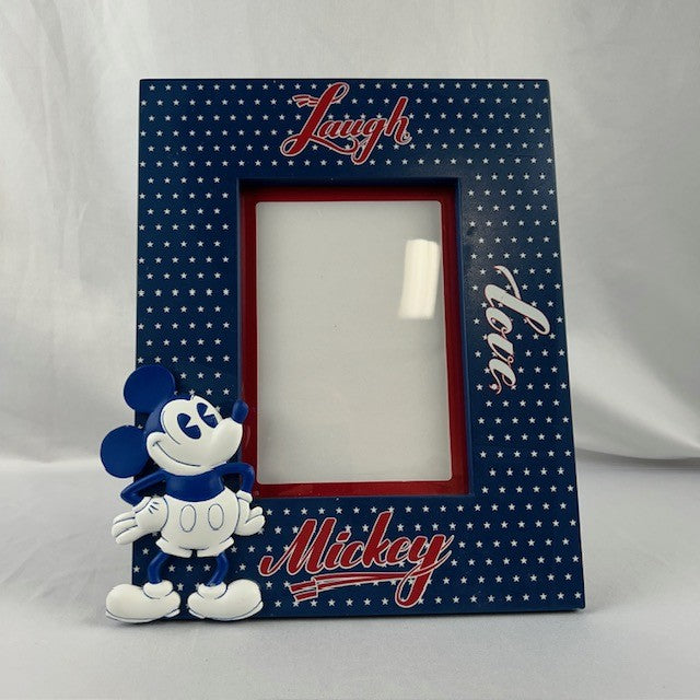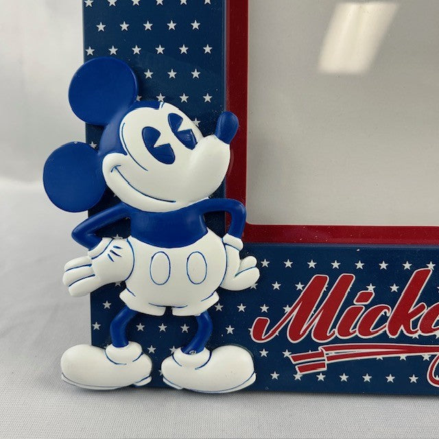 Sturdy resin photo frame in a patriotic pattern with relief Mickey figure. Includes hinged easel stand. In excellent condition. Measures 11"H x 9.5"W.