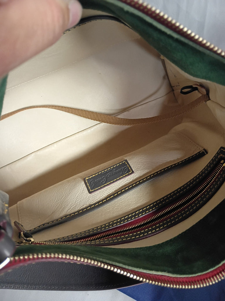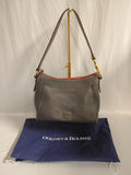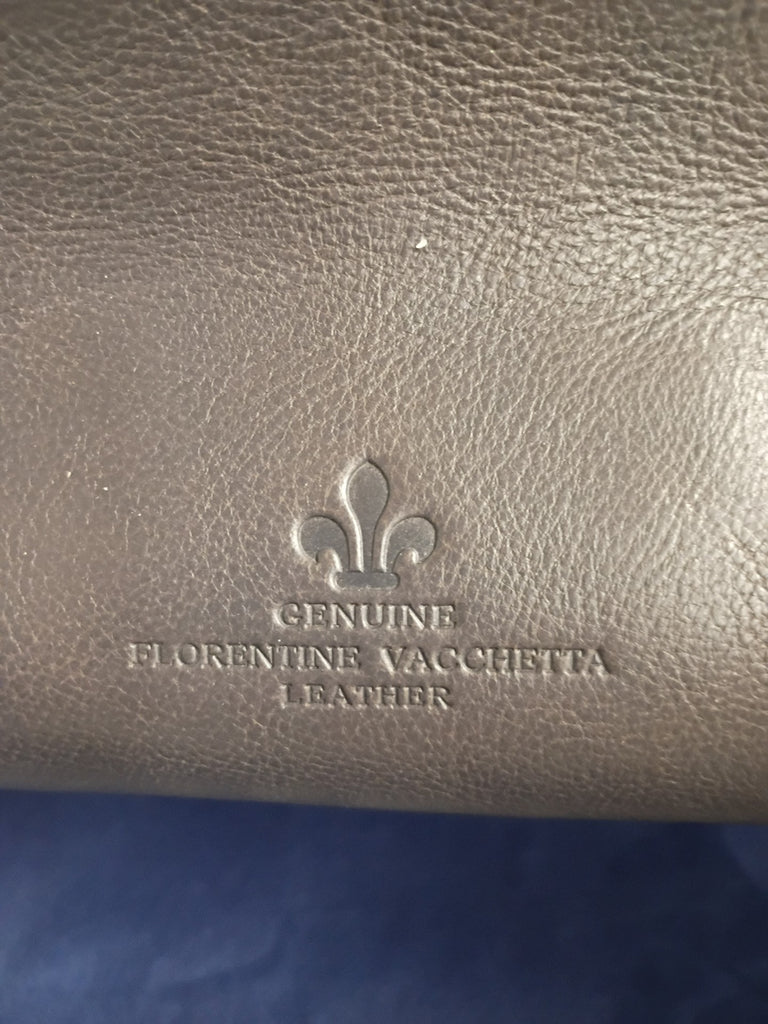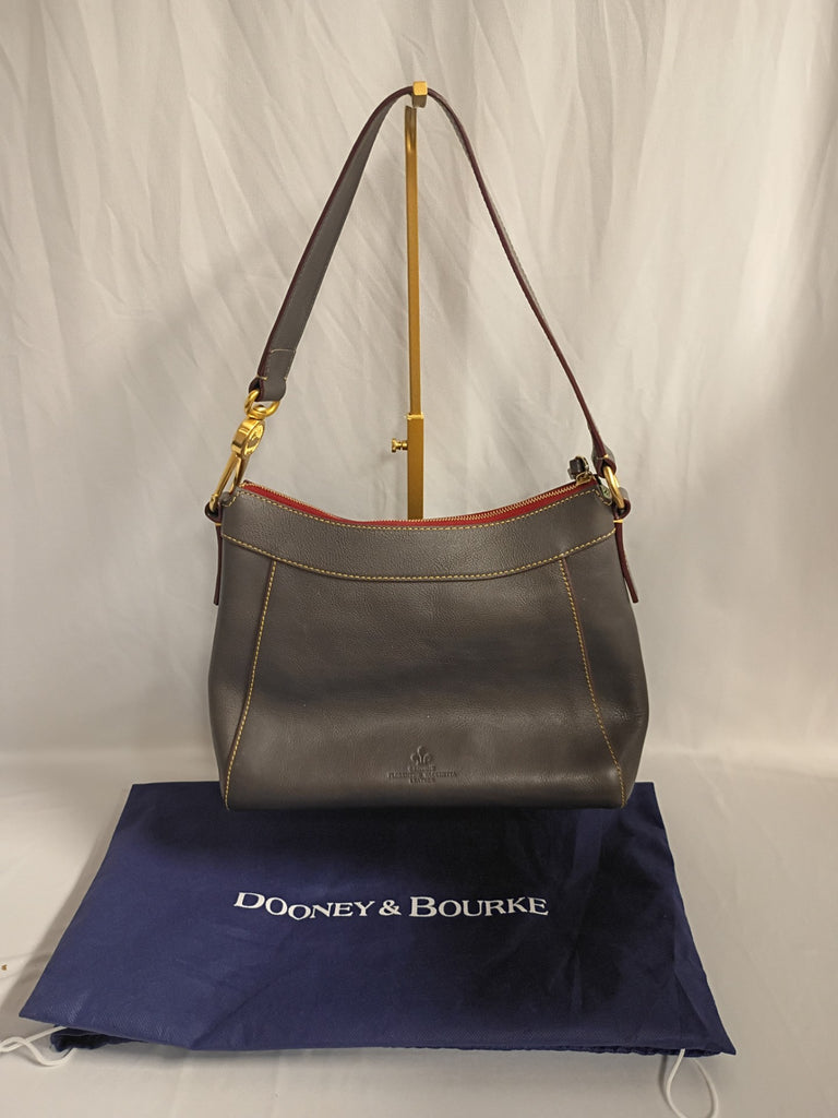 Dark taupe Dooey & Bourke hand bag in excellent condition. Crafted from Florentine Vaccheta Leather accented with brass hardware. Comes with branded garment bag for safe keeping. Measures 14"L x 5"W x 8"H with a 10" handle drop.