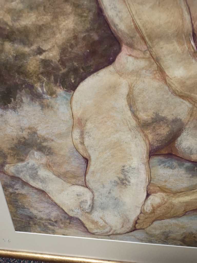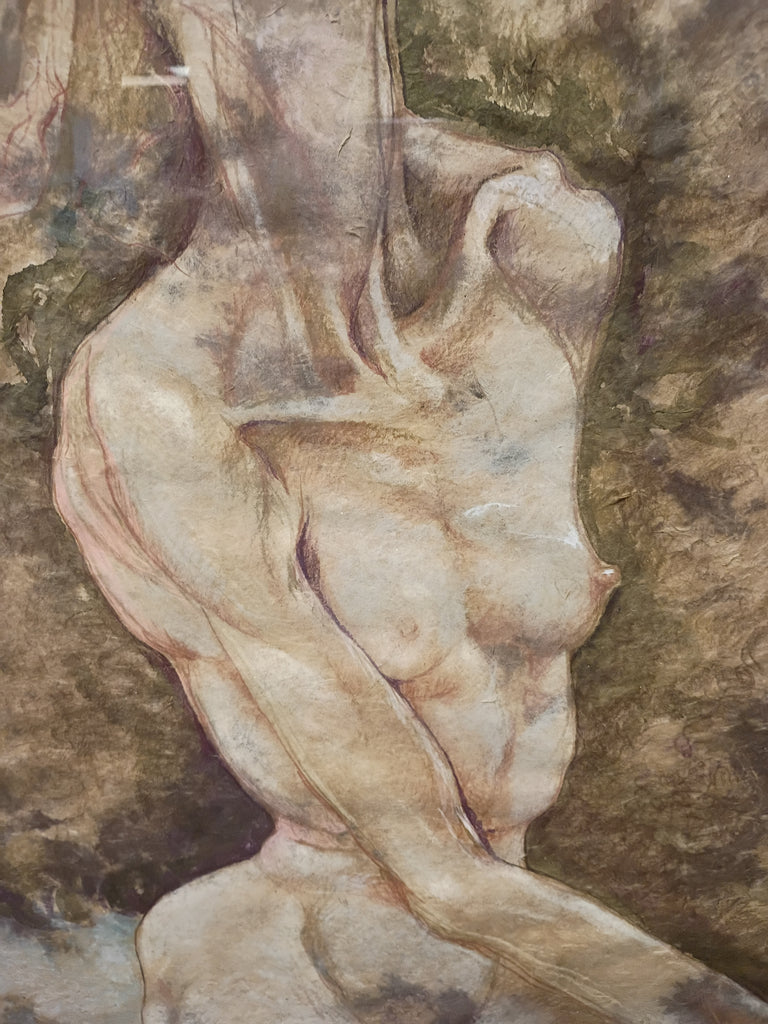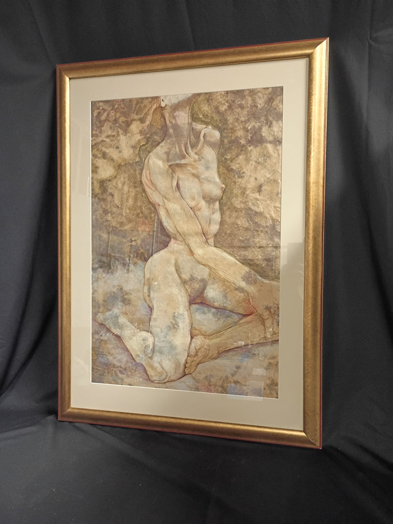 Large framed and matted mixed media composition of a female nude. Done in the style of Egon Shiele. Some tears on the back of the frame, but in otherwise excellent condition. Measures a stately 37"L x 26"W in the frame/matting, and 28.25"L x 19"W without.