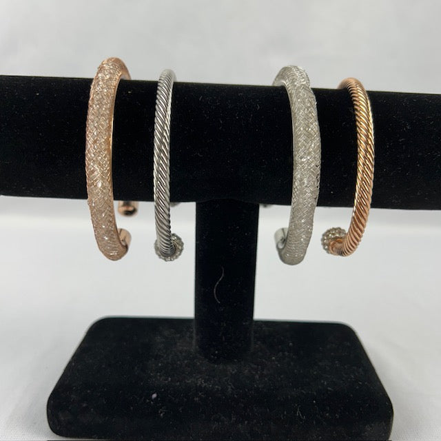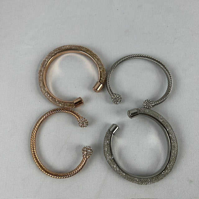 Lot of 4 bangles; all cuff style. Two are wire mesh with chipped glass inside creating a glittering effect, the other two are twisted metal with rhinestone encrusted balls at the closure. All 4 are in great shape and adjustable.