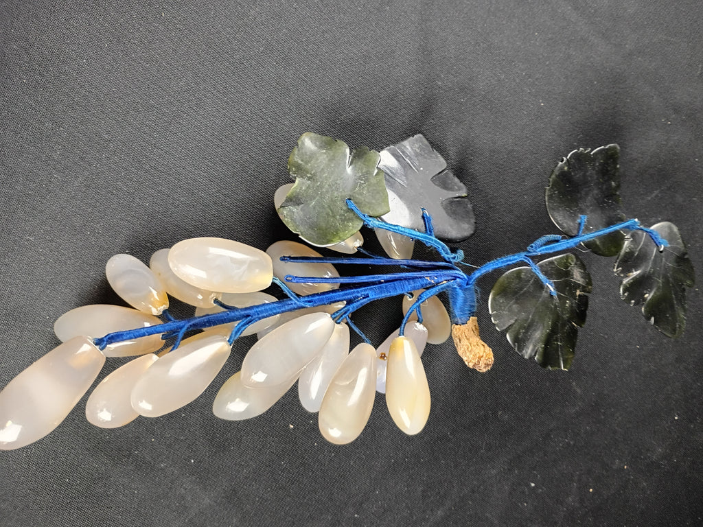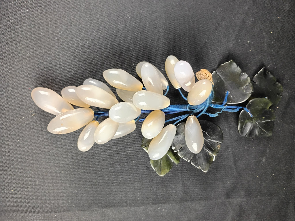 Vintage decorative piece; a carefully hand-carved design of a grape cluster made from jade stone glass. 12"L x 4.5"W. Small chip on one of the leaves (see photo # 3) in otherwise excellent condition.