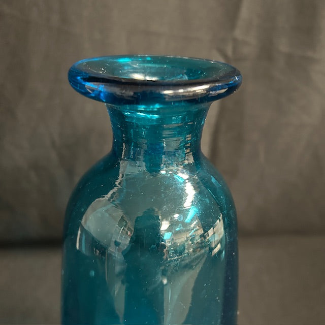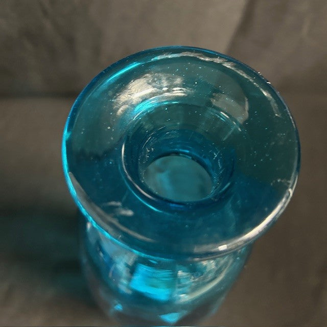 Studio crafted turquoise glass vase. In excellent condition. Lovely ribbed pattern. Measures 11"H x 3"W.