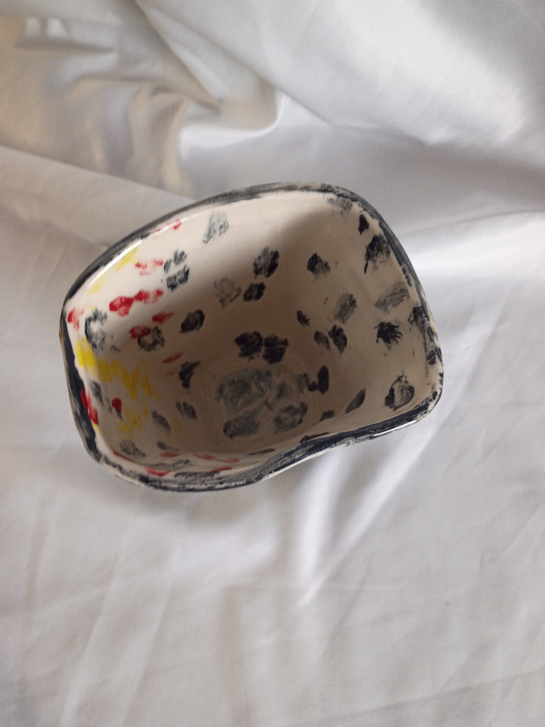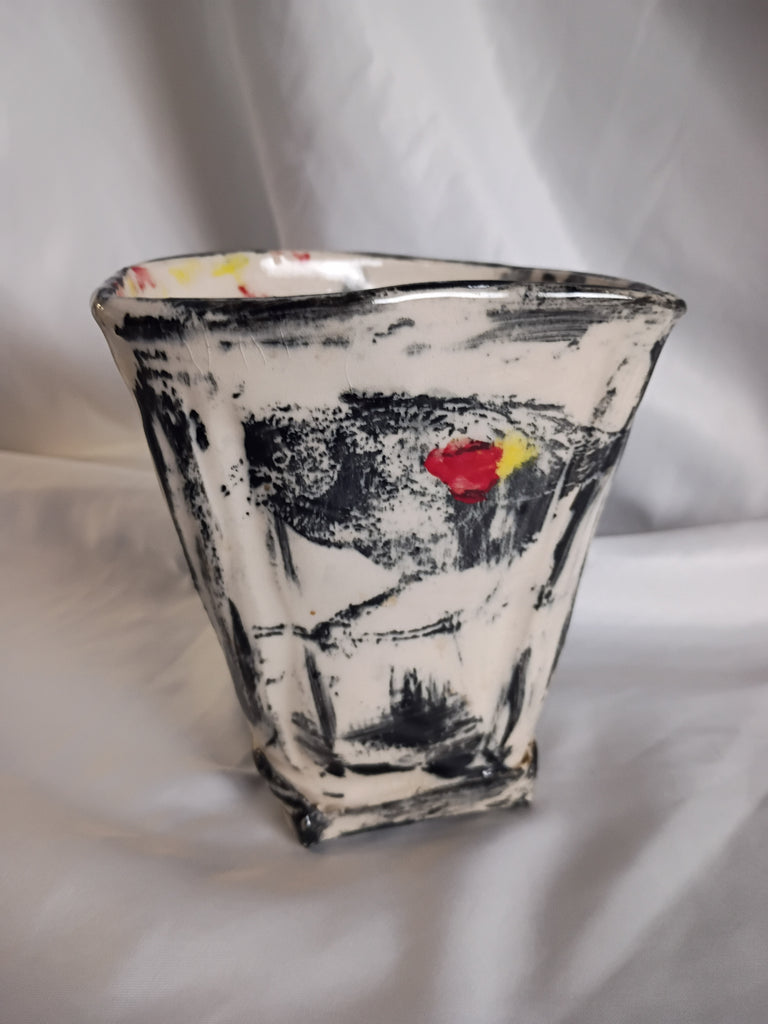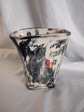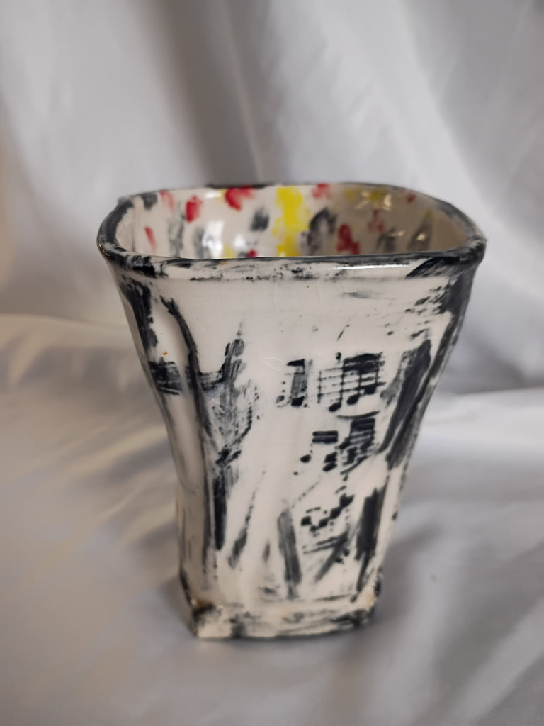 Art pottery vase. Features lovely photographic depiction of birds on either side with music notes and newspaper print. Measures 5"H x 4.5"W. In great condition.