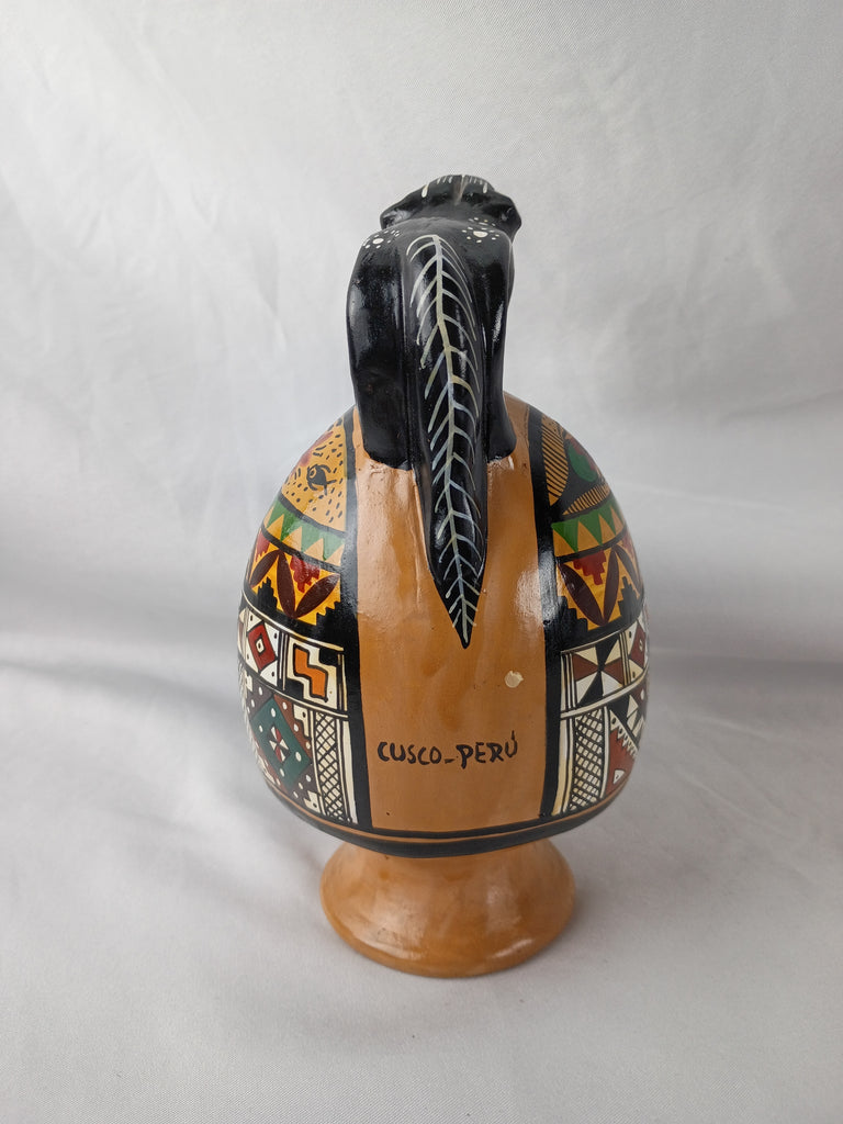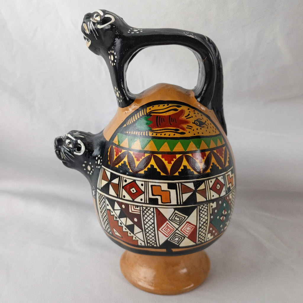 Gorgeous handmade peruvian art pottery piece. Traditional geometric designs with Jaguar figures. Measures 4"L x 3"W x 7"H. In excellent condition.