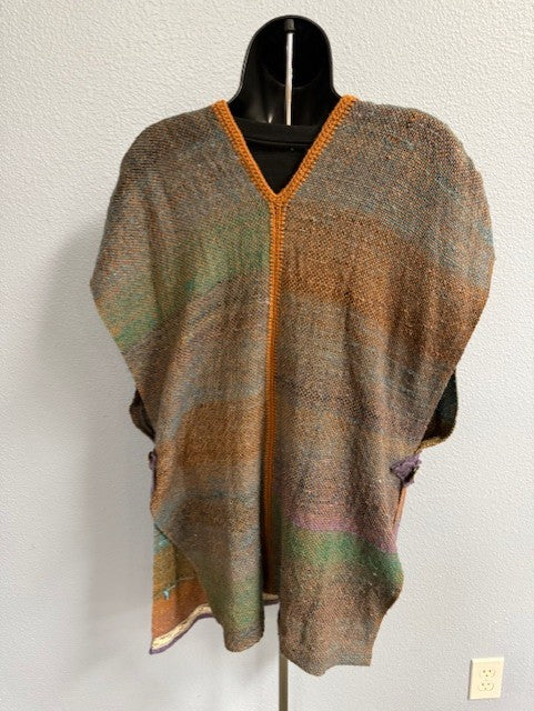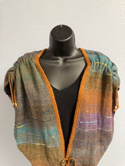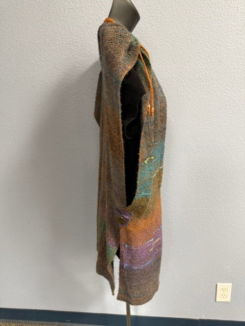 Lovely fall colors, oversized 3 panel vest by Oregon textile artist, Olive Eve Handwoven Co. Looks like size Medium; back panel 30"L and 22"W, front 2 panels 32"L and 11" W. In excellent condition.