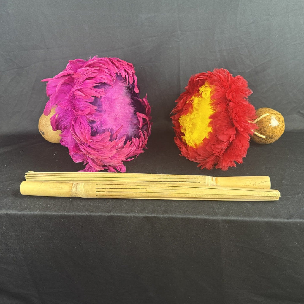 Set of 4 Hawaiian instruments: 2 Uli Ulis, and 2 Pu'ilis. All in great condition. Uli Ulis are feathered maracas, and Pu'ili's are percussion instruments.