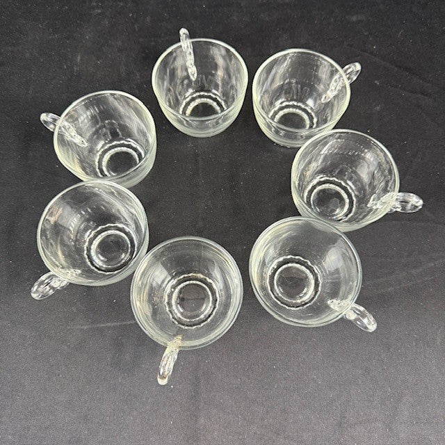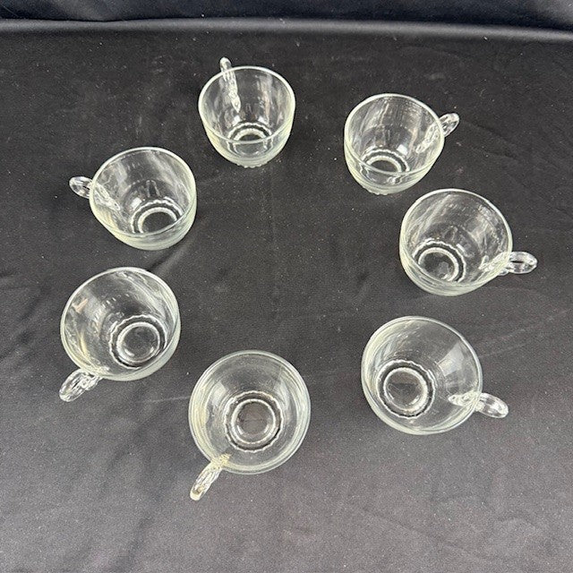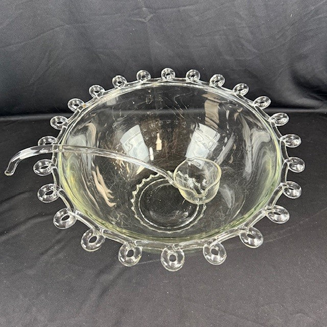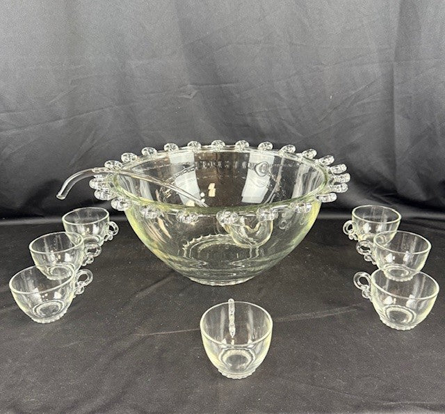 Helsey Lariat Punch Bowl With with 7 cups Cups and one ladle. Measures 15"H x 6.5"W. Cups measure 3"W x 2.5" H. Ladle 12.5"L. Some scratches from frequent use, but in overall great condition.