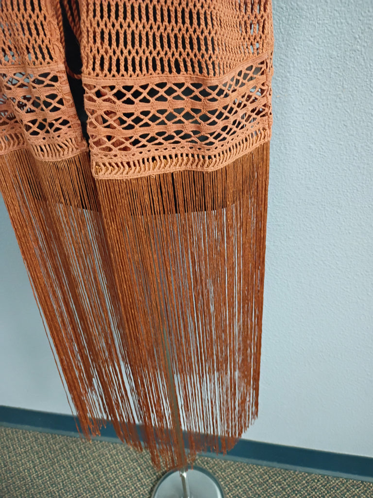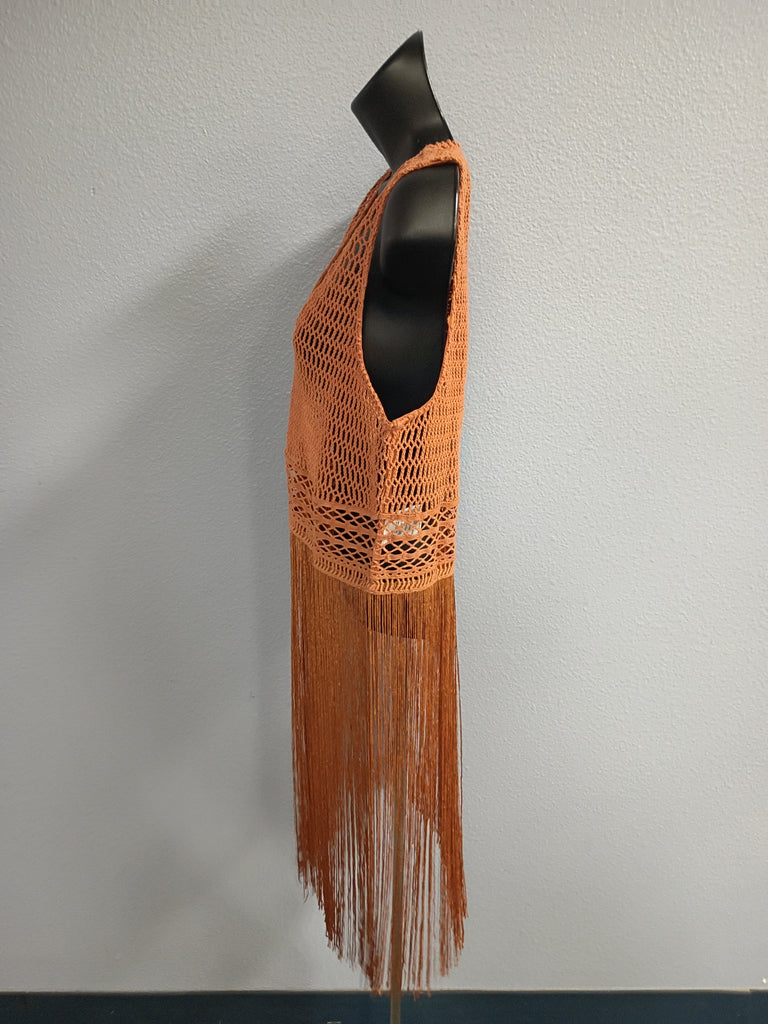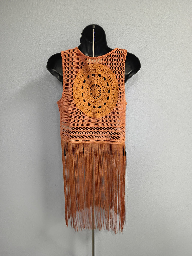 Rock on with this crochet fringe vest in burnt orange from Miranda Lambert's brand, Idyllwind. In excellent condition. Size Medium. Measures 16"L armpit to armpit, 12"L shoulder to shoulder, 36"L hem to shoulder.