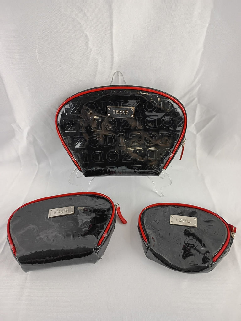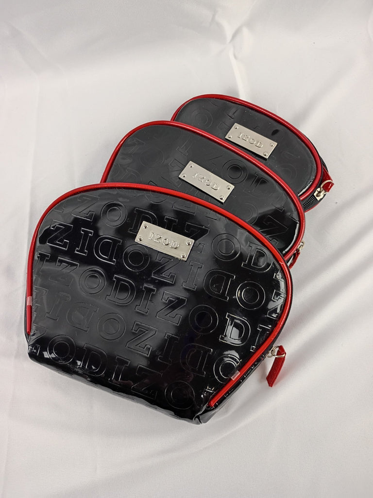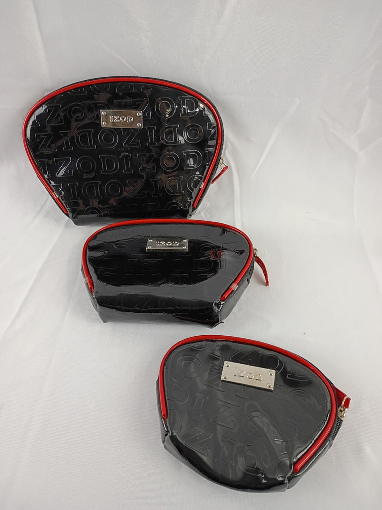 Three IZOD makeup bags in black patent leather with embossed logo. 9"L, 7"L and 6"L inches respectively. Each fits into the other. Great for travel. In excellent condition.