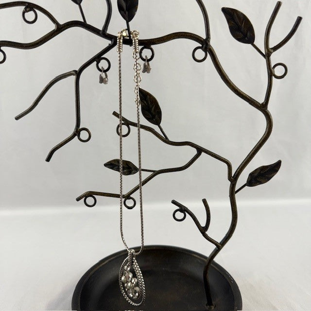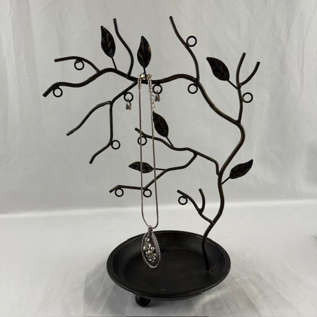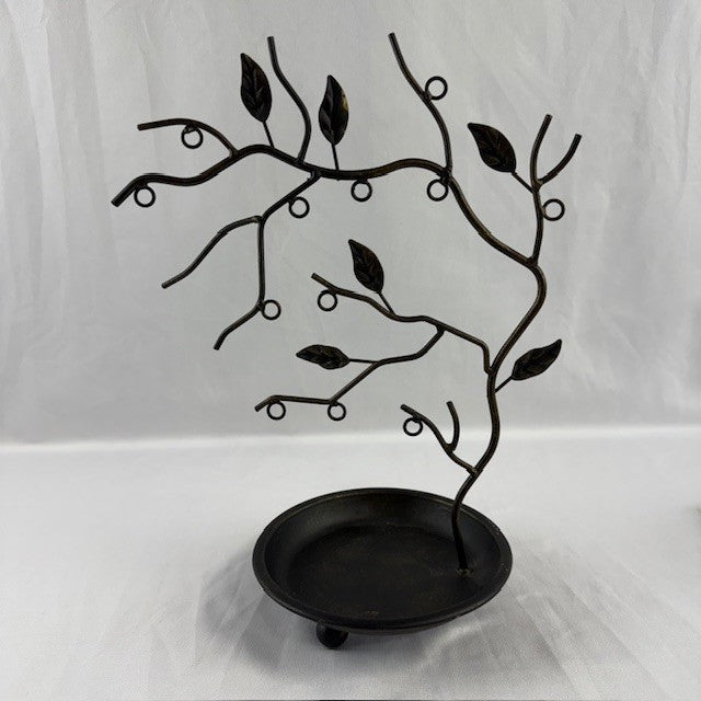 Metal jewelry tree for displaying your beautiful earrings and other jewelry. Tree measures 10"L x 6"W x 14"H. Tray: 6: dia.