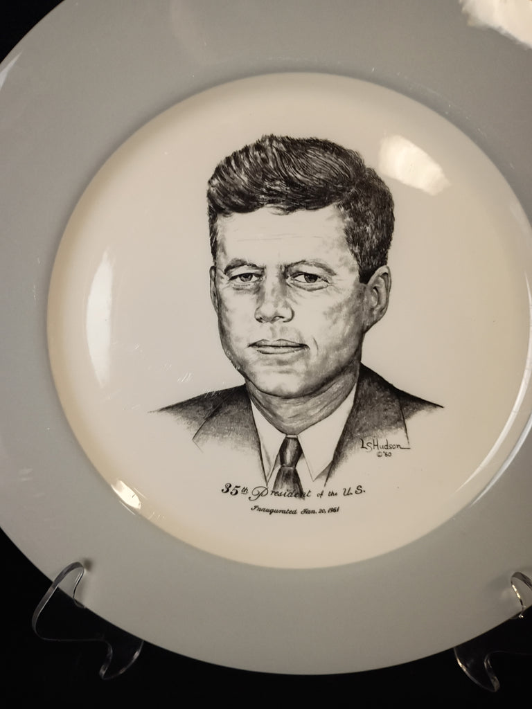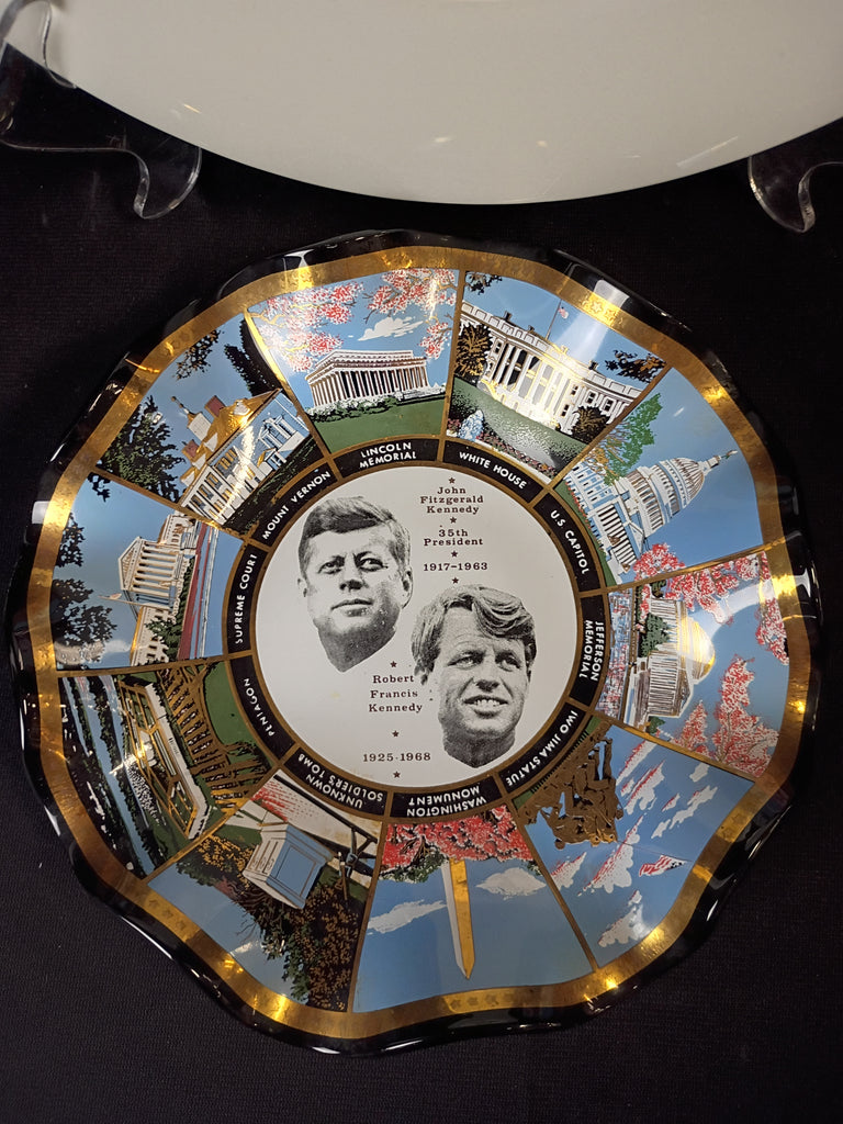 Set of two JFK themed collectors plates. The large plate measures 10.5"D, and the smaller plate is 7.5"W x 1.25"H. The smaller plate is by Houze Art and the larger by Delano Studios. Both in great condition.