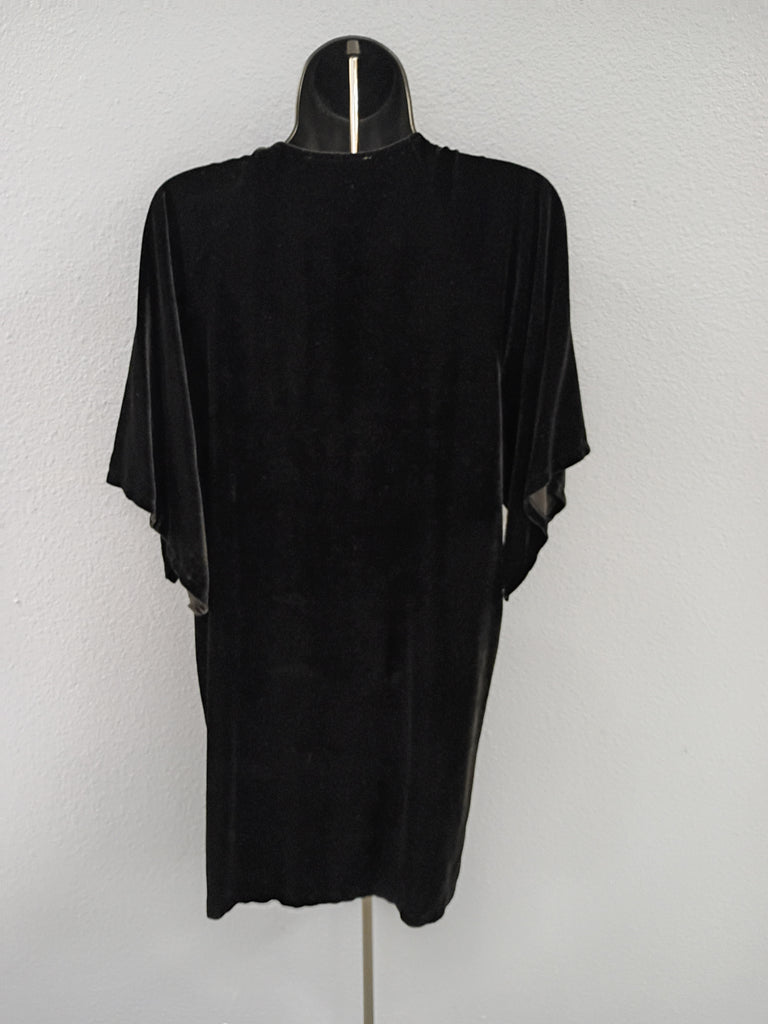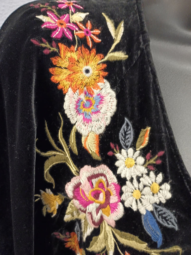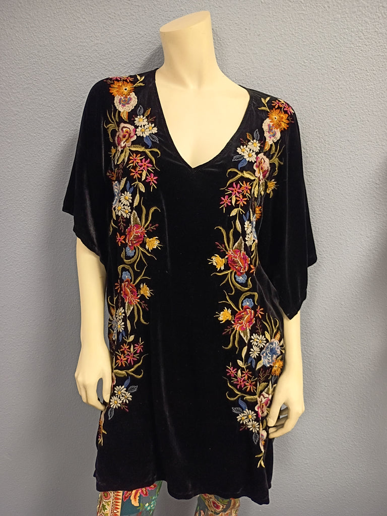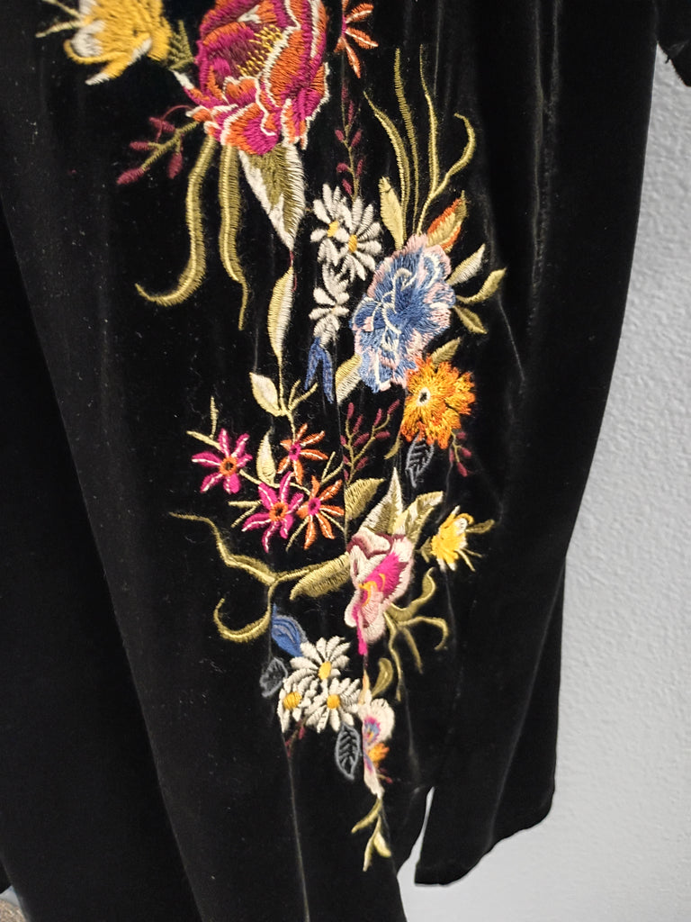 Johnny Was black velvet dress. Floral embroidery on the front in multicolor. In excellent condition. Labeled Size XS but fits more like a medium; measurements: 19"L shoulder to shoulder, 19"L armpit to armpit, and 31.5"L shoulder to hem.