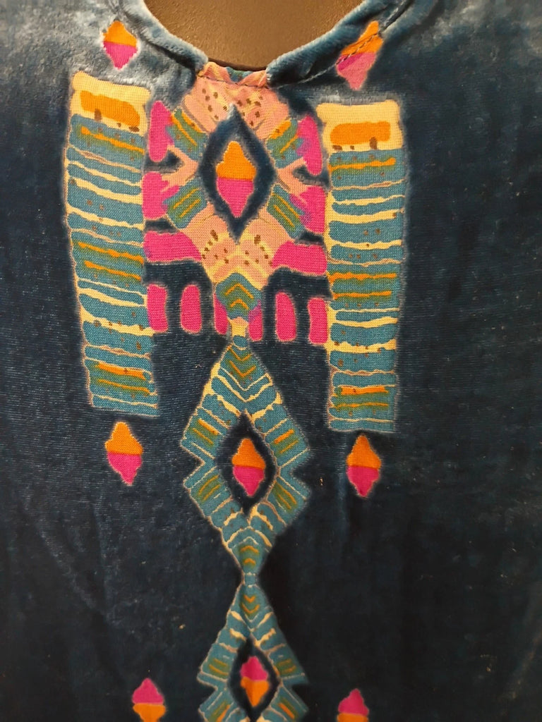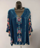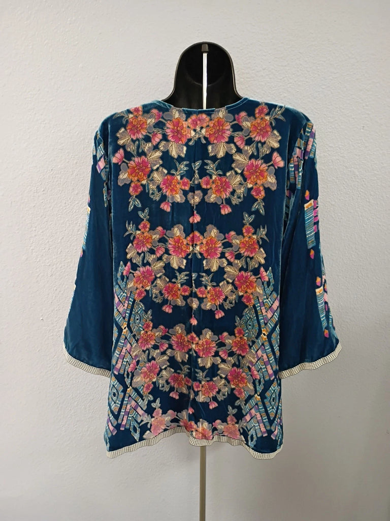 Johnny Was Silk Burnout Fabiana Teal Blue Shirt Top. Size medium. Velour front, and sheer back. Tribal and floral patterns in warm tones on deep blue background. In great condition. Size medium. Measurements 21.5"L armpit to armpit, 17"L shoulder to shoulder, 26.5"L shoulder to hem.