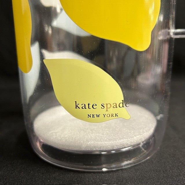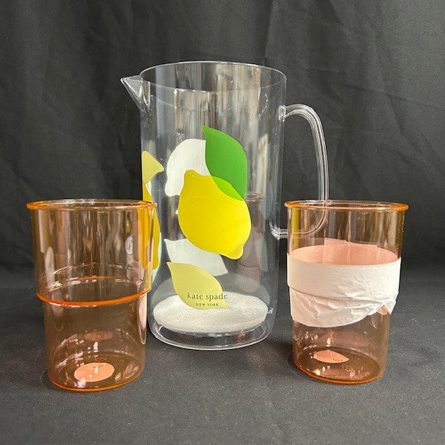 Kate Spade Acrylic Lemon Pitcher and 2 cups. In new condition. Measures 6"L x 5"W x 9"H.