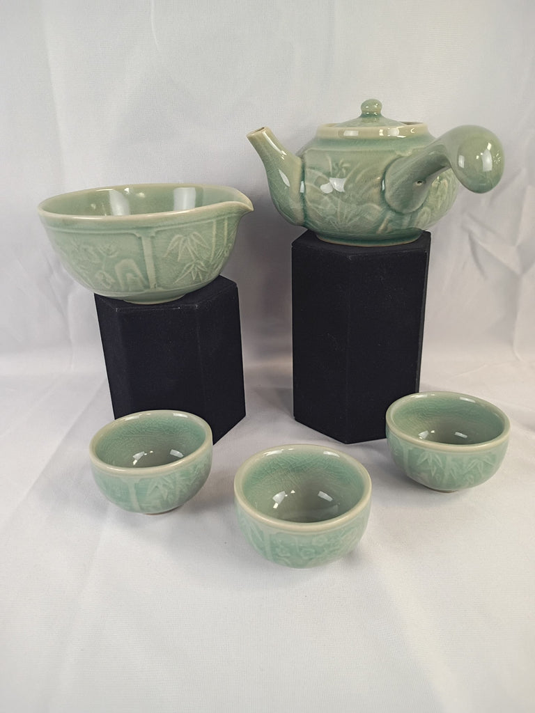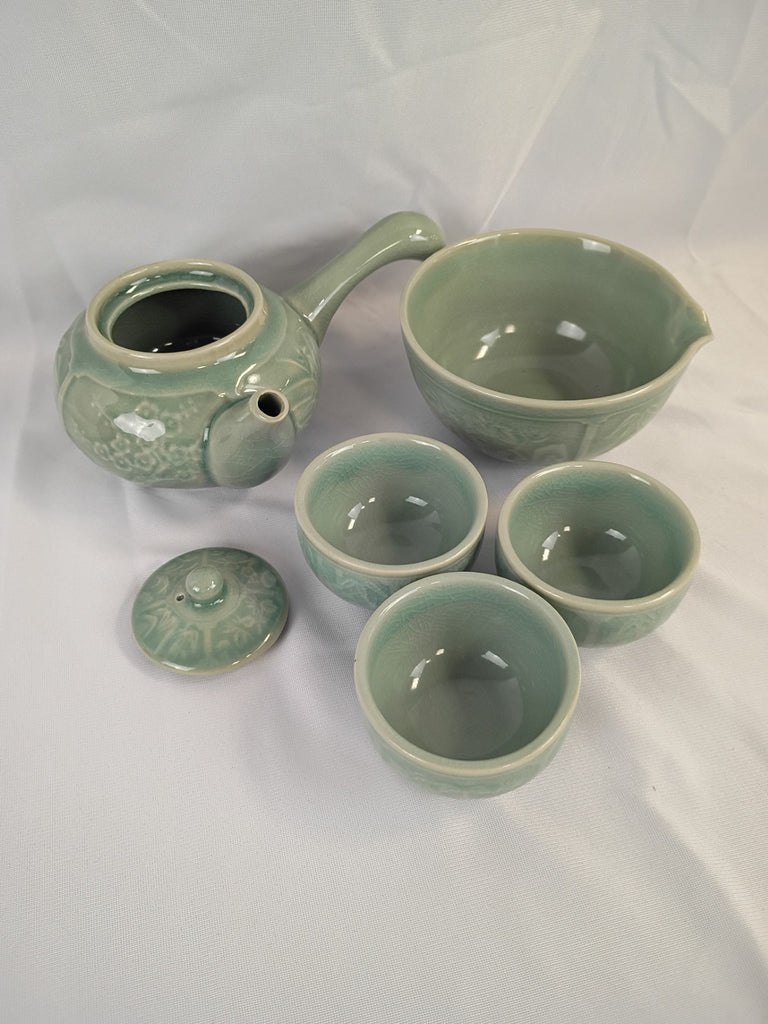 Korean Traditional Handmade Jade Celadon Tea Set. Ergonomic handle for a comfortable grip. Tea set includes: 3 cups, 1 teapot (Dahgwan), 1 hot-water cooler (Sookwoo).