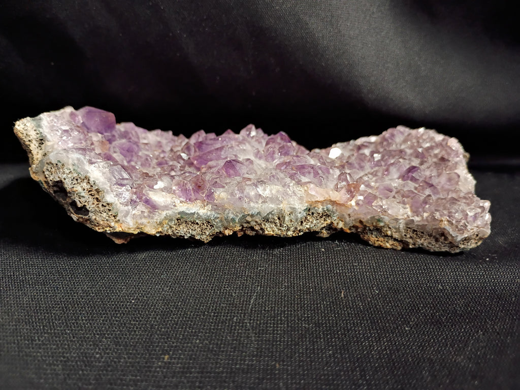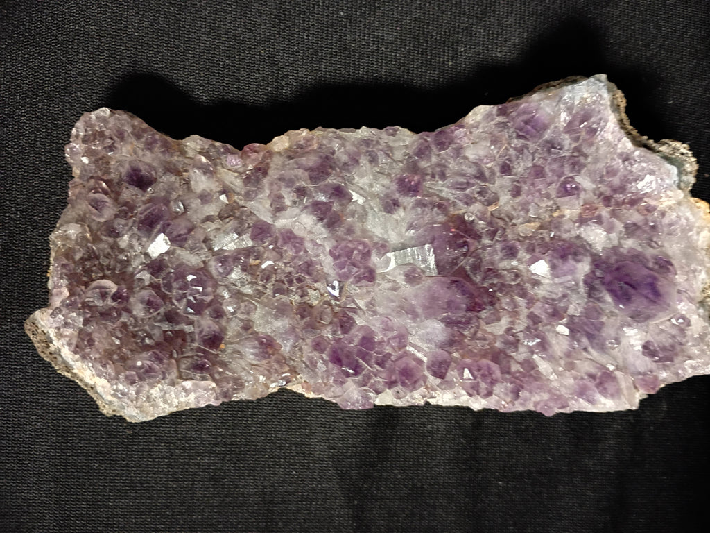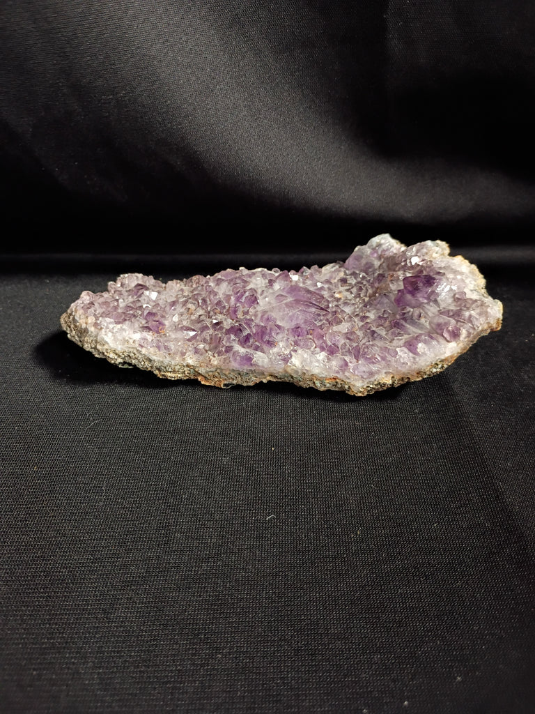 Large amethyst crystal specimen. Dazzling natural formations in purple. Measures 6"L x 3.25"W x 1.25"D. In great condition.