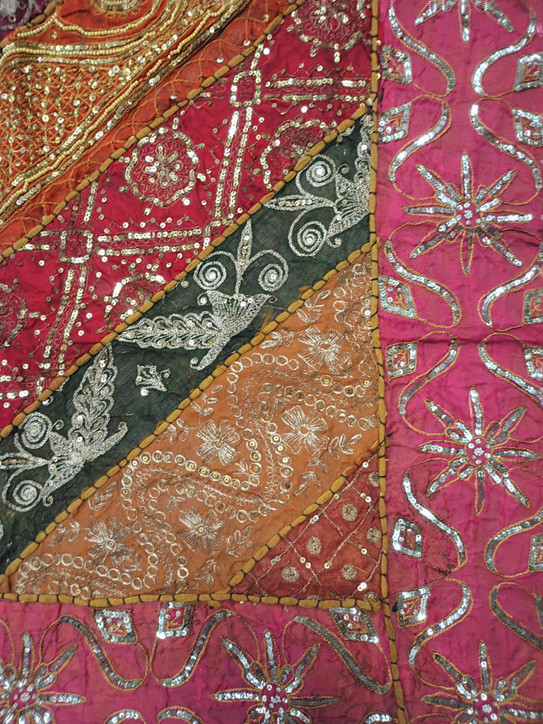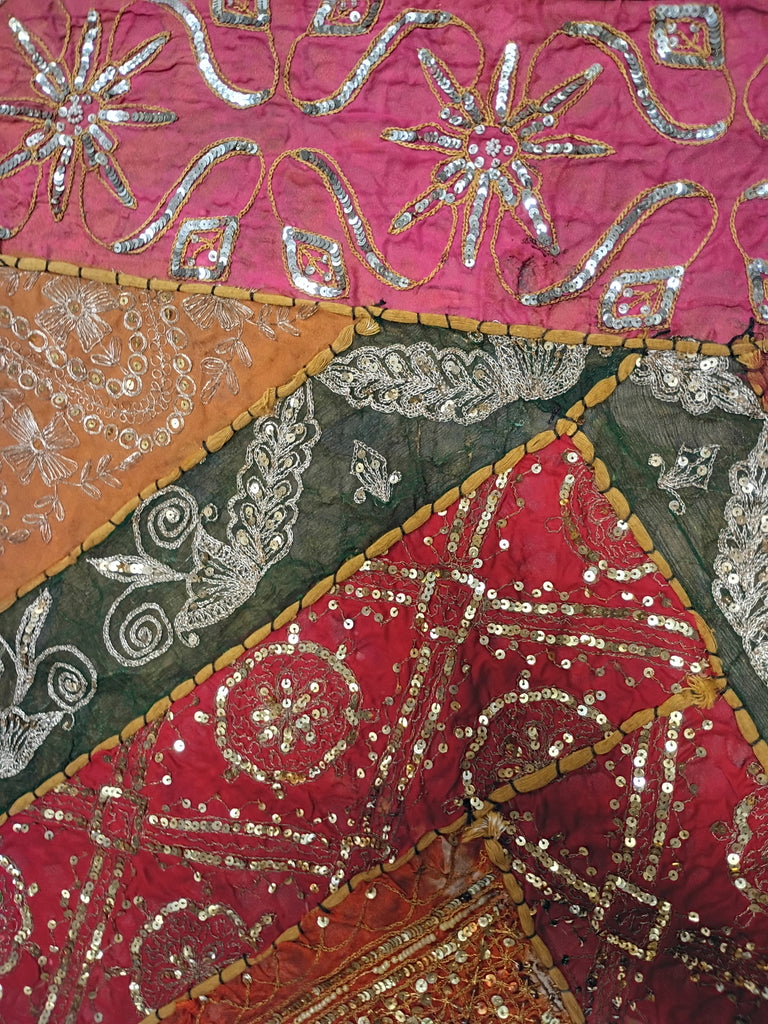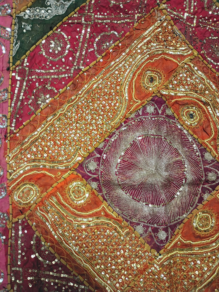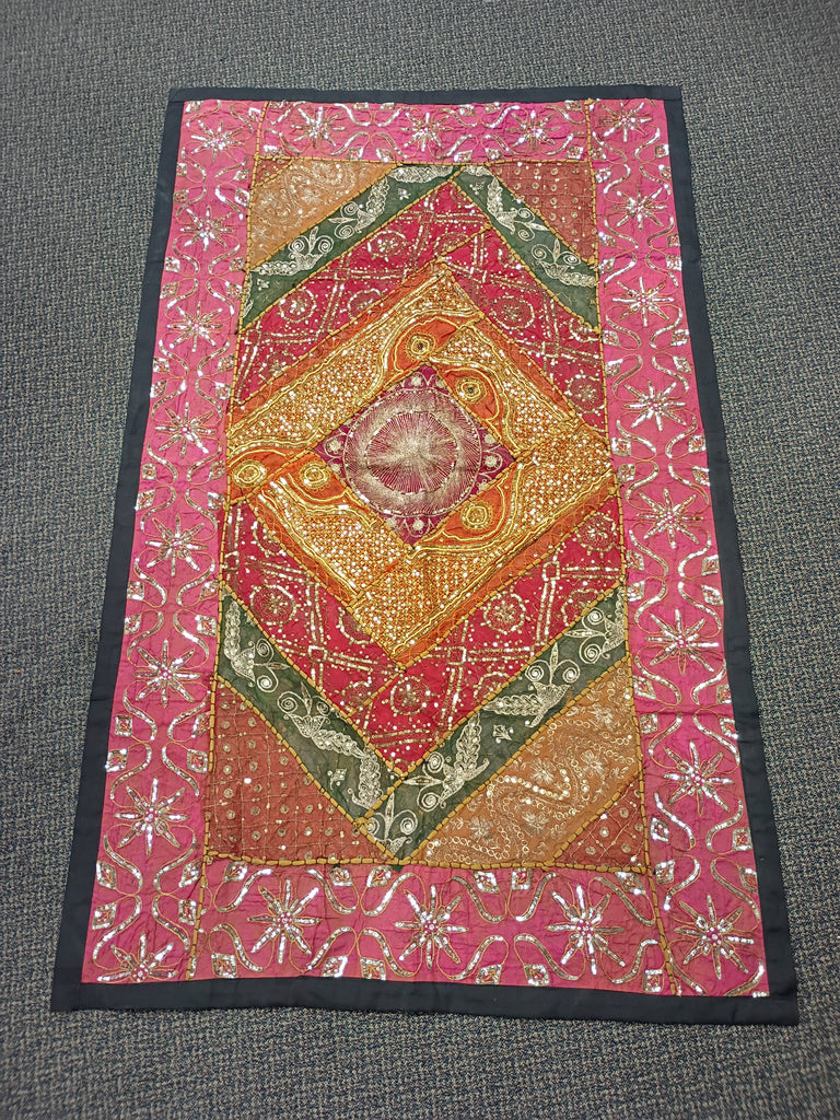 Large wall tapestry - hand made. Likely from India. Some wear but in overall good condition. Measures 59"L x 36"W.