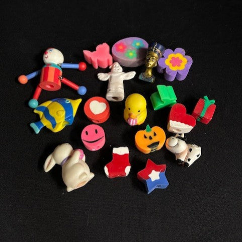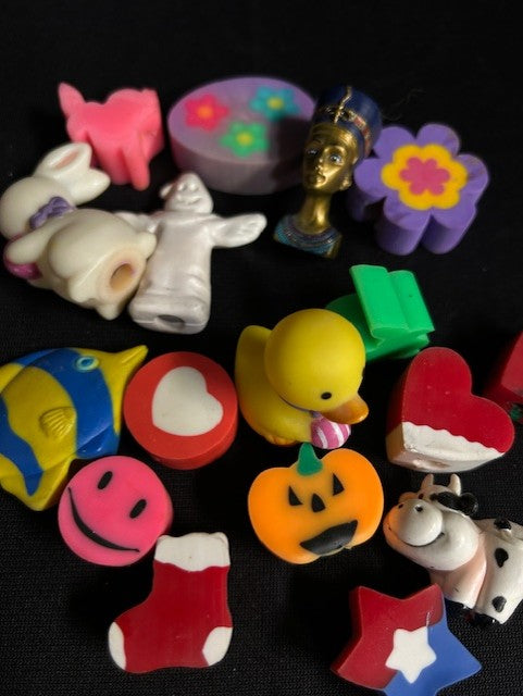 Lot of 18 vintage pencil toppers and erasers: 11 erasers, 7 toppers. Toppers included: rubber ducky, egyptian pharaoh, tropical fish, clown, etc. Erasers: jackolantern, bunnies, smiley face, flower, star, etc. All in good condition. Great for kids or collectors.