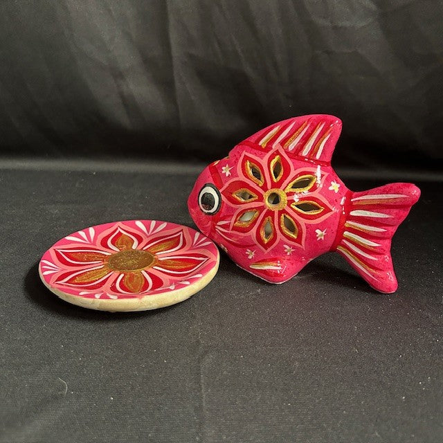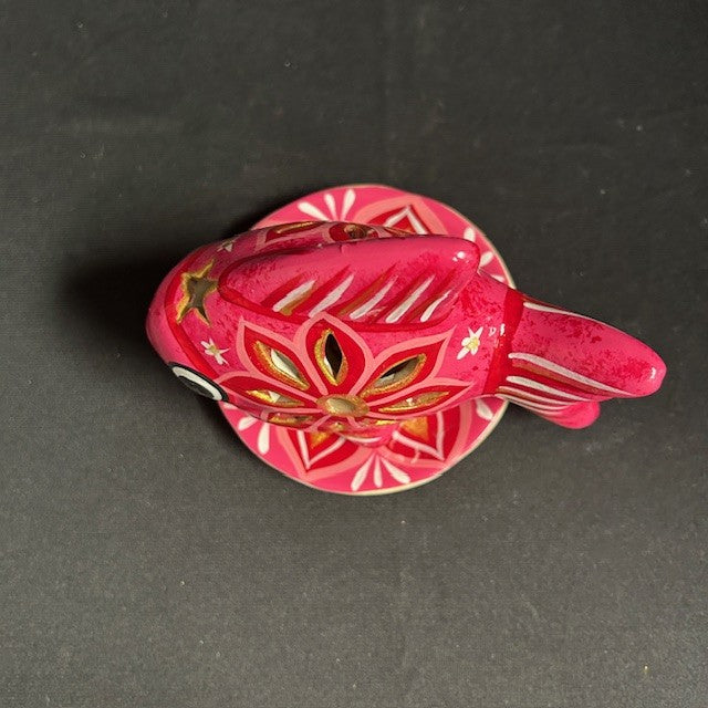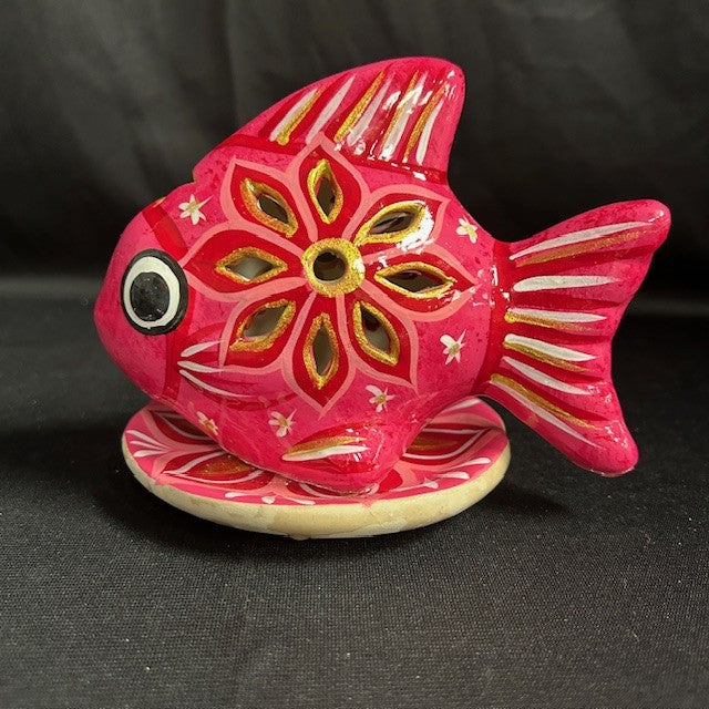 Art pottery piece handmade in Mexico. Perforated fish form with matching base. Pink, white, and gold. Fish sits on top of the base where you'd place a tea-light candle so the fish glows! In excellent condition. base is appx 4.5"W, fish is 6"L x 2"W x 4.5"H.