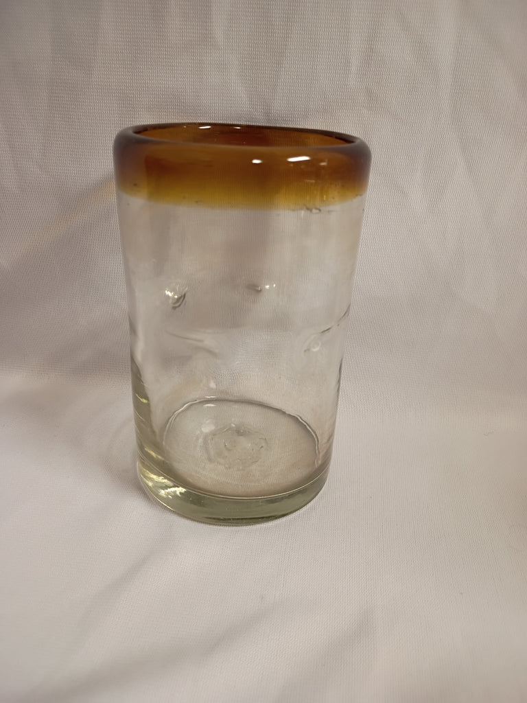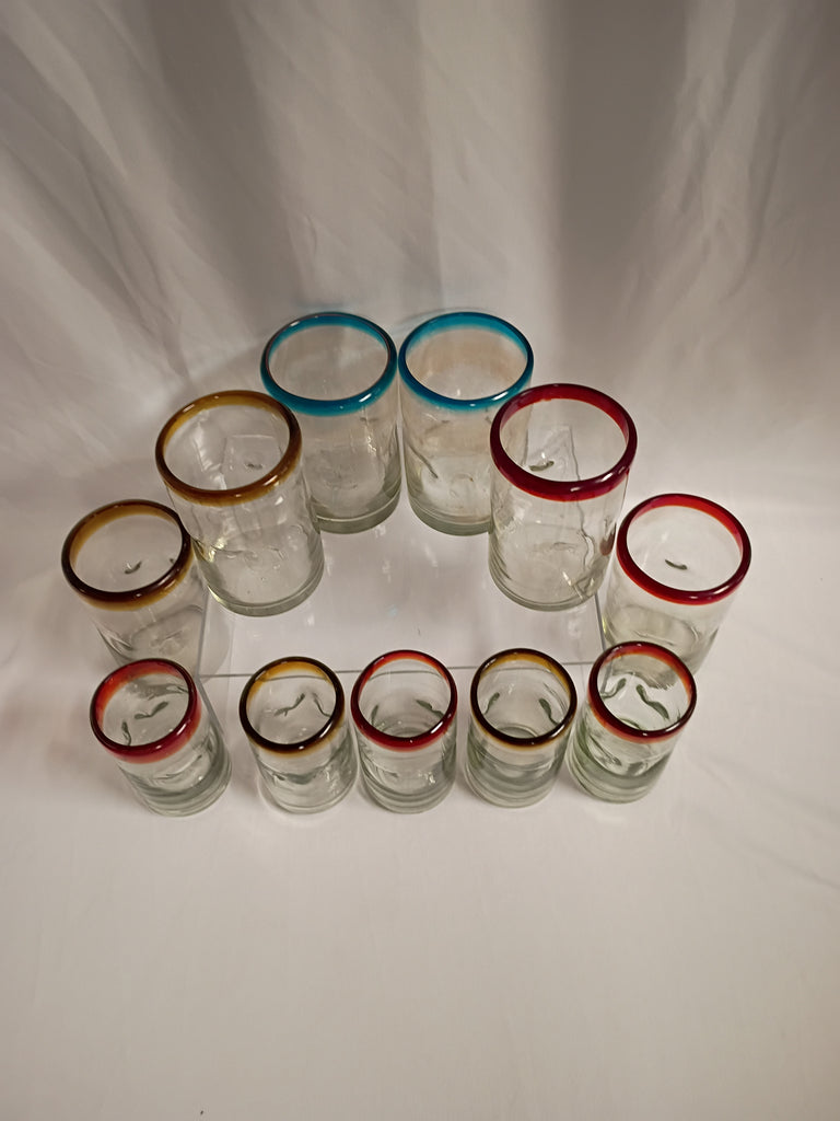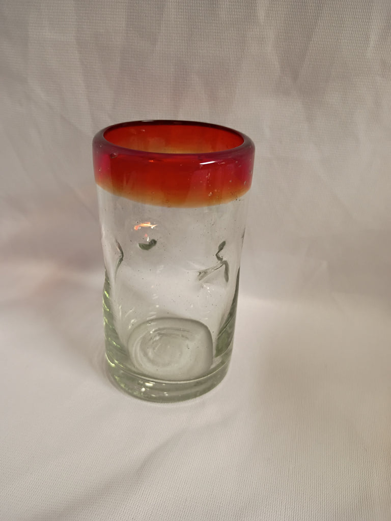 Art glass drinking vessels with ergonomic dimples. Small glasses measure 4.5"H x 2.5"W, the big glasses measure 5"H x 3"W.