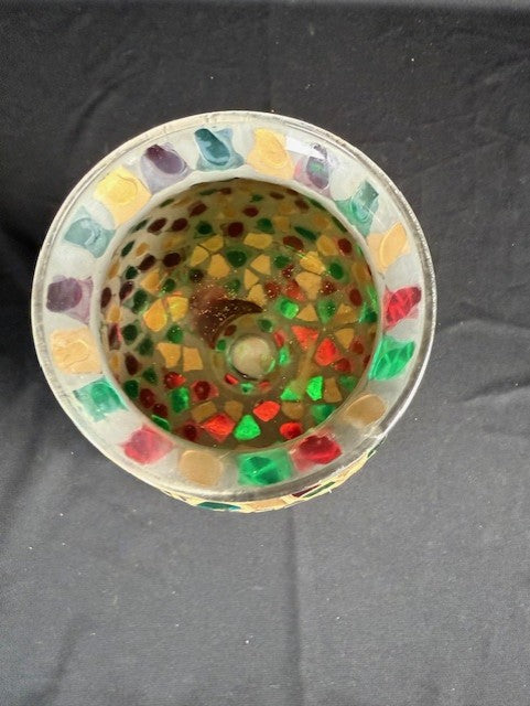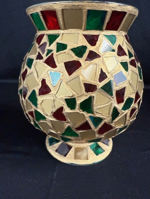 Red, green and gold mosaic stained glass vase. Perfect for the holiday season. Let it glow by placing a large white pillar candle inside. Measures 7"H x 5"W.