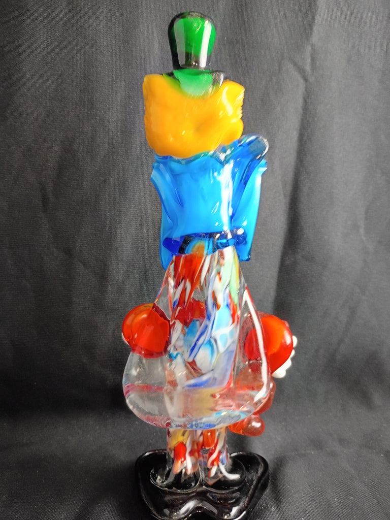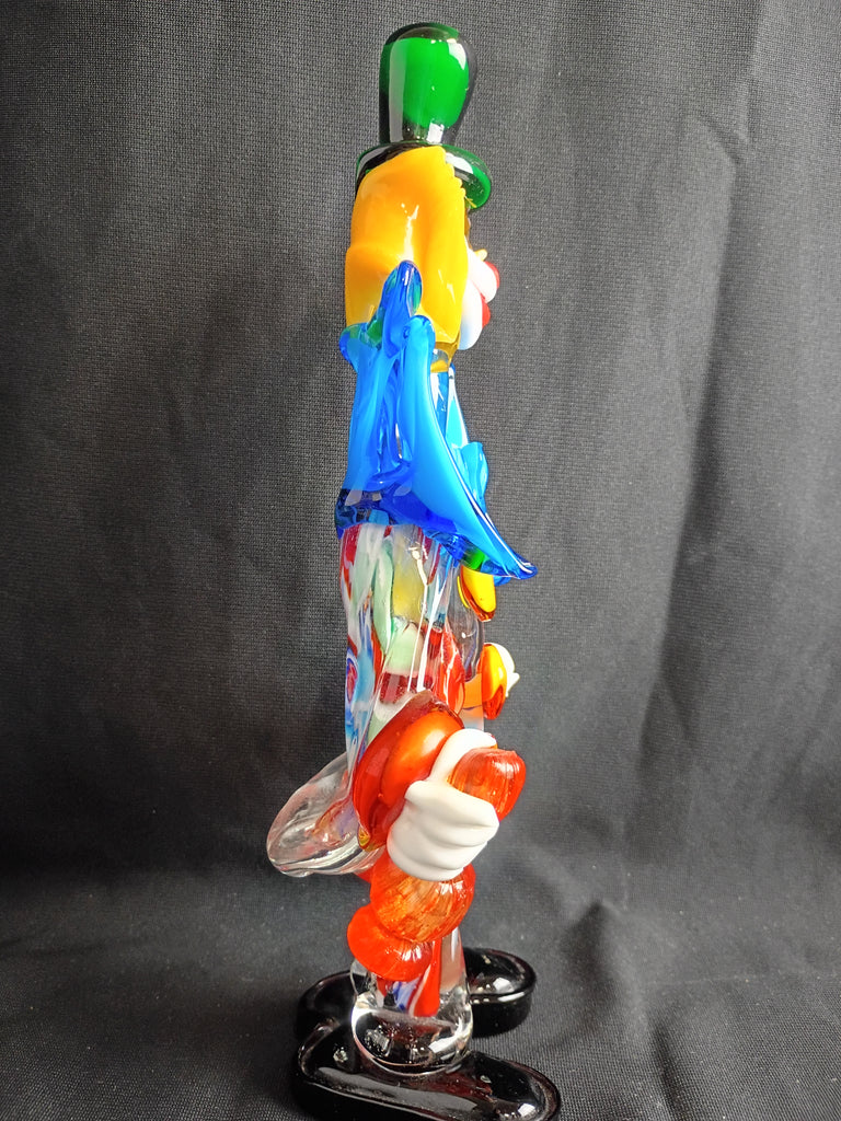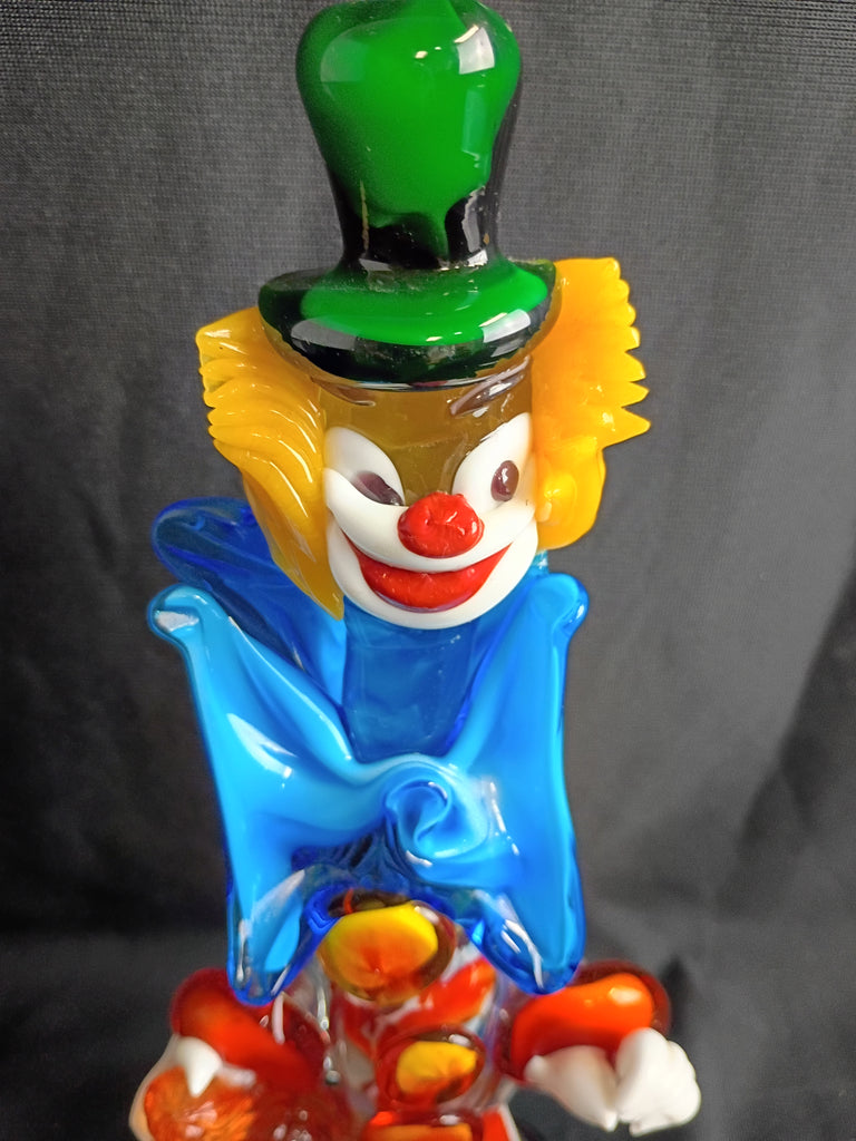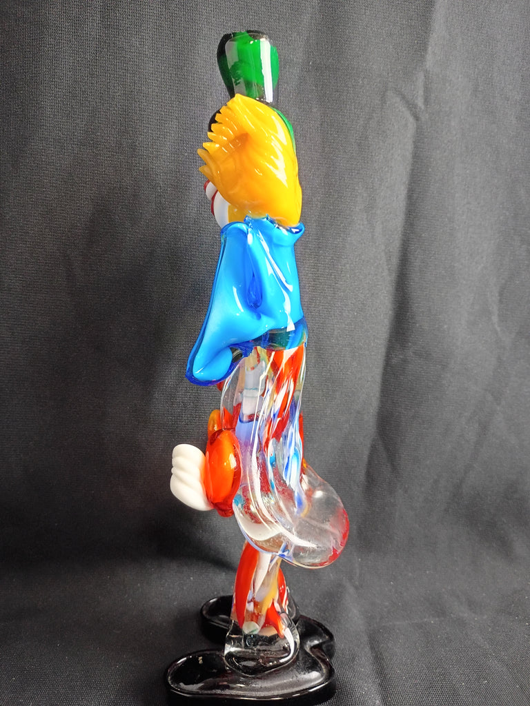 Murano glass clown. Exquisitely hand crafted in multicolor. Lovely details throughout. Small chip on one side; reflected in price. In otherwise excellent condition. Measures appx 4"L x 3"W x 10"H.