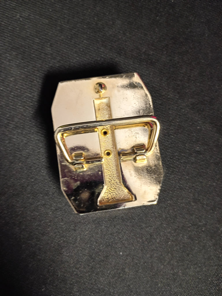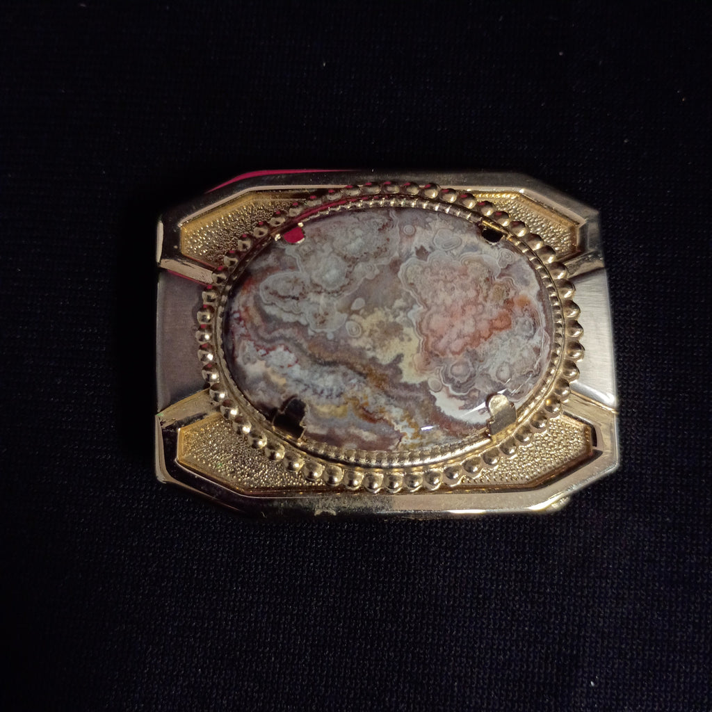 Gorgeous gold tone belt buckle adorned with large brown and pink ocean jasper cabochon in prong setting. In excellent condition. Measures appx 2.25"L x 1.75"H.