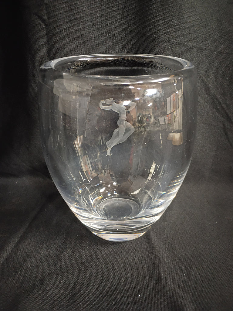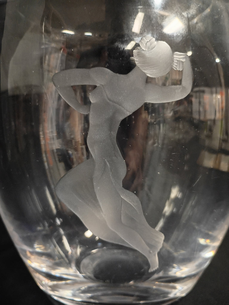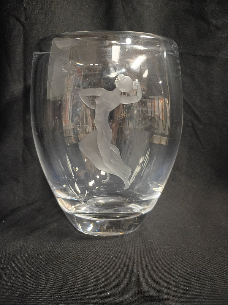 Striking Vintage Crystal Vase attributed to Orrefors. Lovely Etched dancing woman on the front. In excellent condition. Measuring 8.5" H x 6"W.
