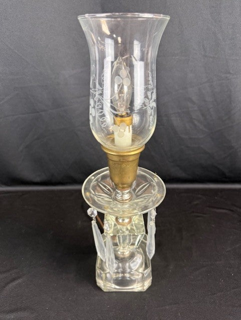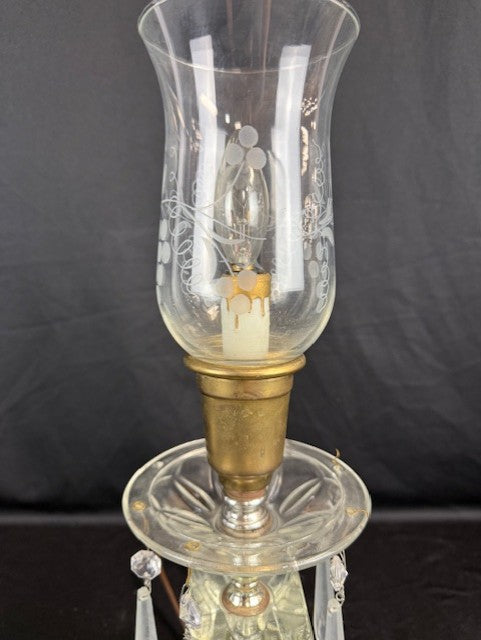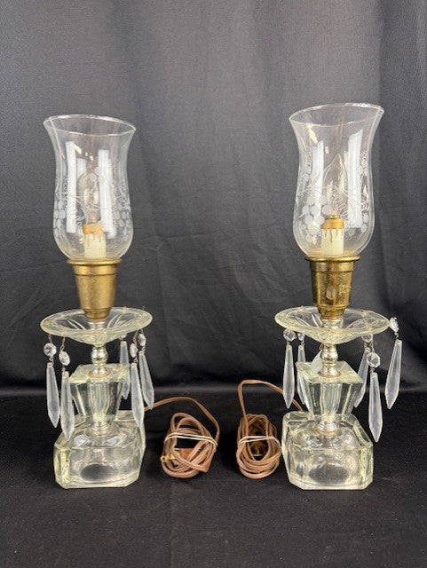 Pair of Vintage crystal lamps. Both are missing some crystal droplets: 3 missing from one and 2 missing on the other. Otherwise both in great working condition. The hurricane glass features a lovely grape pattern. Each measures appx 15.625"H x 5"W.