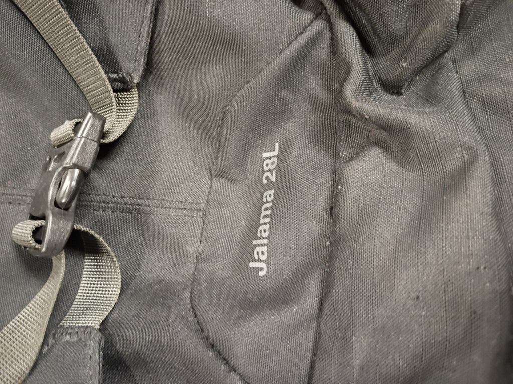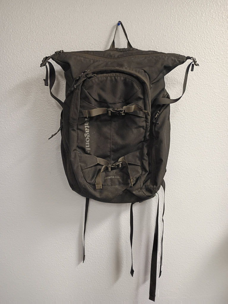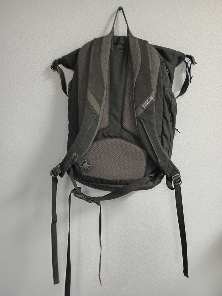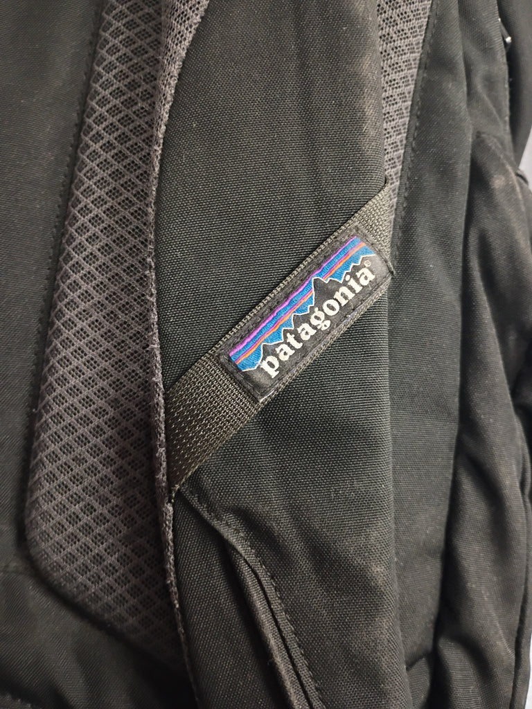 Roll top Patagonia black backpack. Measures 13"L x 7"W x 18"H and holds 28 Liters. Shows signs of wear but in overall great condition. Great for camping, day hikes, or as luggage.