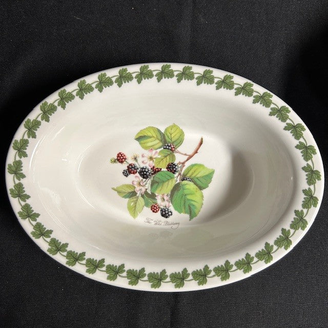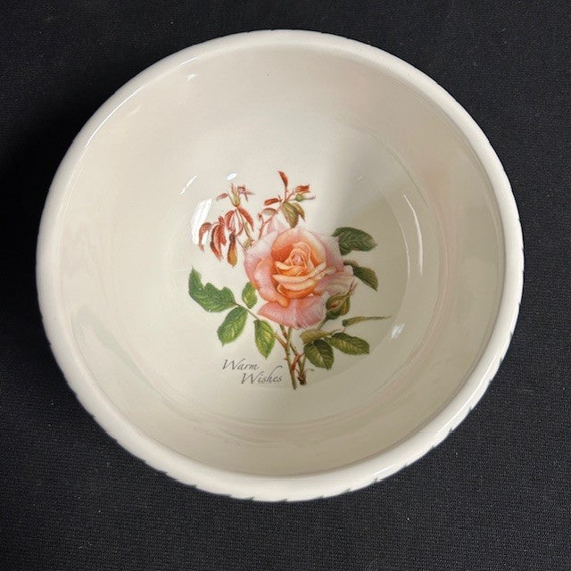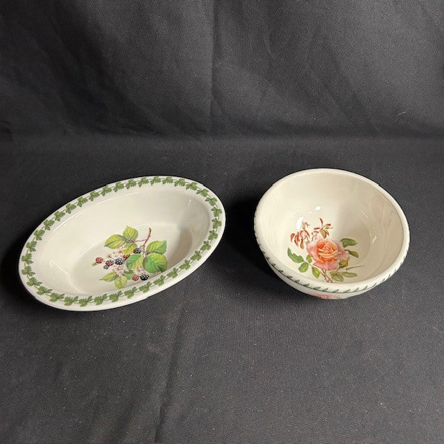 Great set of a bowl & small casserole for serving food. The bowl shows 3 different roses with edging of leaves, where the casserole dish has berries with a geen grape vine edging. Can be used to serve together for a dinner or hors d'oeuvres! Dishwasher, microwave, refrigerator safe! Bowl 5.50" W x 2.25" H, casserole 8"L x 5.5"W x 1.75" H. Both in great condition.
